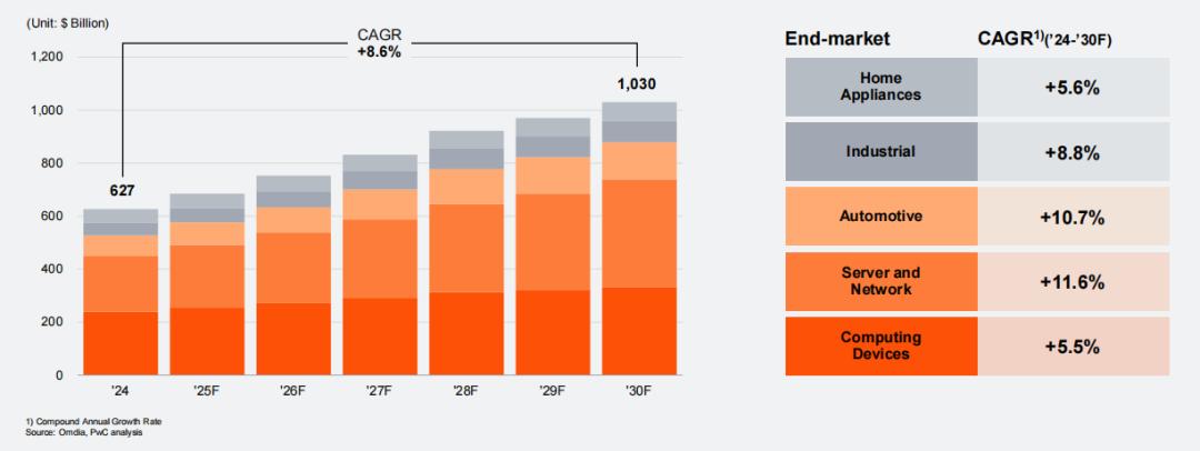 普华永道提出,在众多细分领域中,服务器与网络半导体预计将保持 11.6% 的年增长率领跑增长,这主要得益于生成式 AI 服务的迅猛发展。紧随其后的是汽车领域,预计将以 10.7% 的年增长率位居第二,这得益于电动汽车和自动驾驶技术的突破性进展。