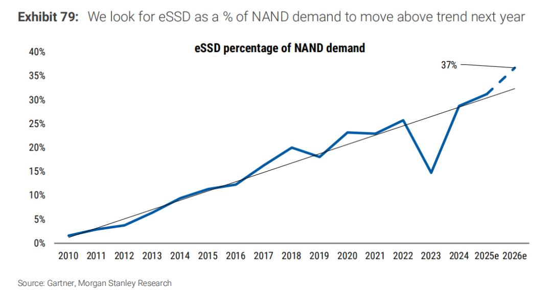 NAND 方面,预计明年位增长可达 20%-25%,为行业多年来的最高水平。目前大摩预计 eSSD 的年增长率将达到 40%-50%。2026 年。尽管电子固态硬盘 (eSSD) 市场规模的预测与估算存在差异,但鉴于超大规模采购订单的规模 (主要采购商每家约 40EB),且我们目前认识到这些需求主要为增量需求,我们认为市场每年新增 120EB 以上的 eSSD 容量似乎非常可行。