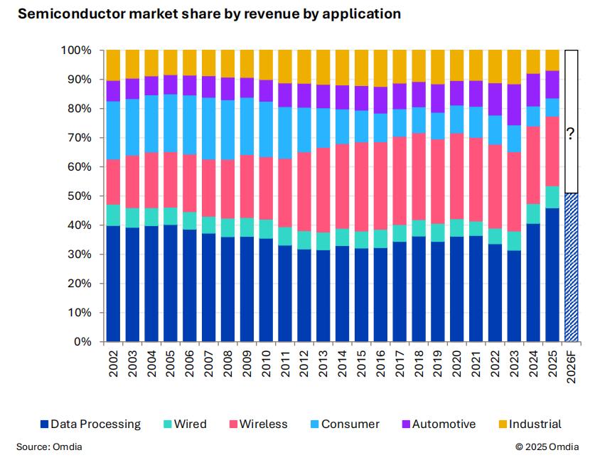 根据 Omdia 的分析,数据中心市场份额正加速向 50% 逼近。过去二十多年间,数据中心在全球半导体收入中的占比始终稳定在 30% 至 40% 之间。然而,过去两年这一格局被迅速改写,数据中心市场收入实现翻倍增长,仅 2023 年至 2025 年就新增约 2000 亿美元,使其占全球半导体总收入的比重攀升至 46%。Omdia 进一步指出,2026 年可能成为突破 50% 的关键节点。