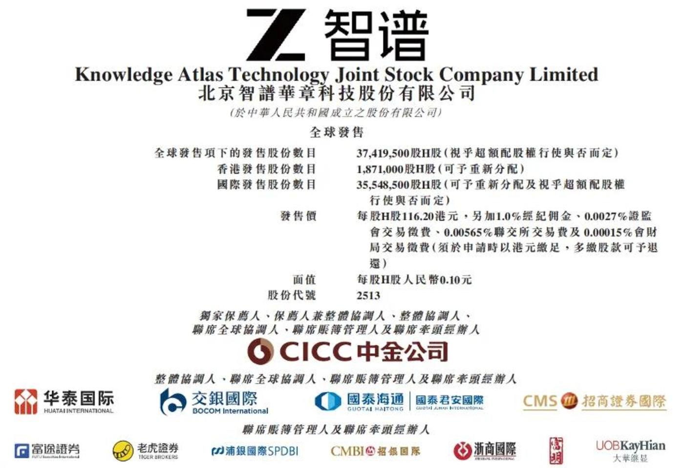 按照招股书披露,智谱此次 IPO 拟发行 37,419,500 股 H 股,其中香港公开发售 1,871,000 股,国际发售 35,548,500 股。若按每股 116.2 港元的发行价计算,本次募资规模预计约 43 亿港元,对应 IPO 市值有望超过 511 亿港元 (均不计 「绿鞋」 机制)。