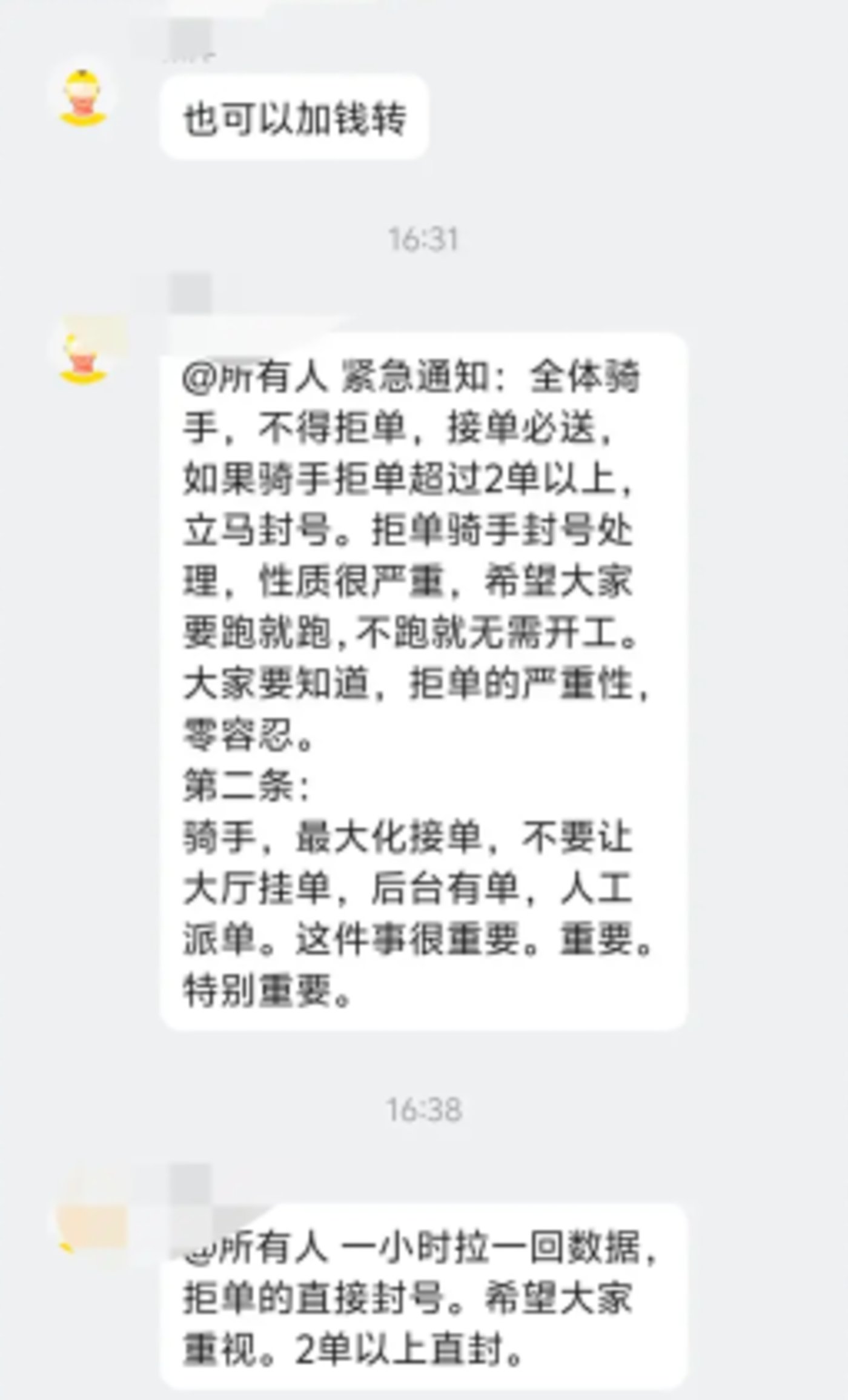 有骑手直接分享了群消息,拒单两单以上者立马封号。