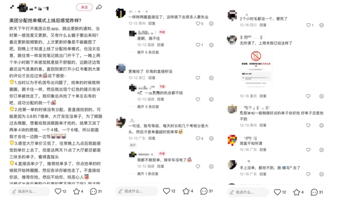 这一模式的变革,在美团众包骑手群体中引发了不小的讨论。部分骑手直言 「不满」,认为自己失去了核心的 「自由」,收入也受到影响,但也有另一部分骑手表示支持,觉得新模式能打击长期困扰行业的 「外挂」 抢单问题,让订单分配更公平,收入也更稳定。