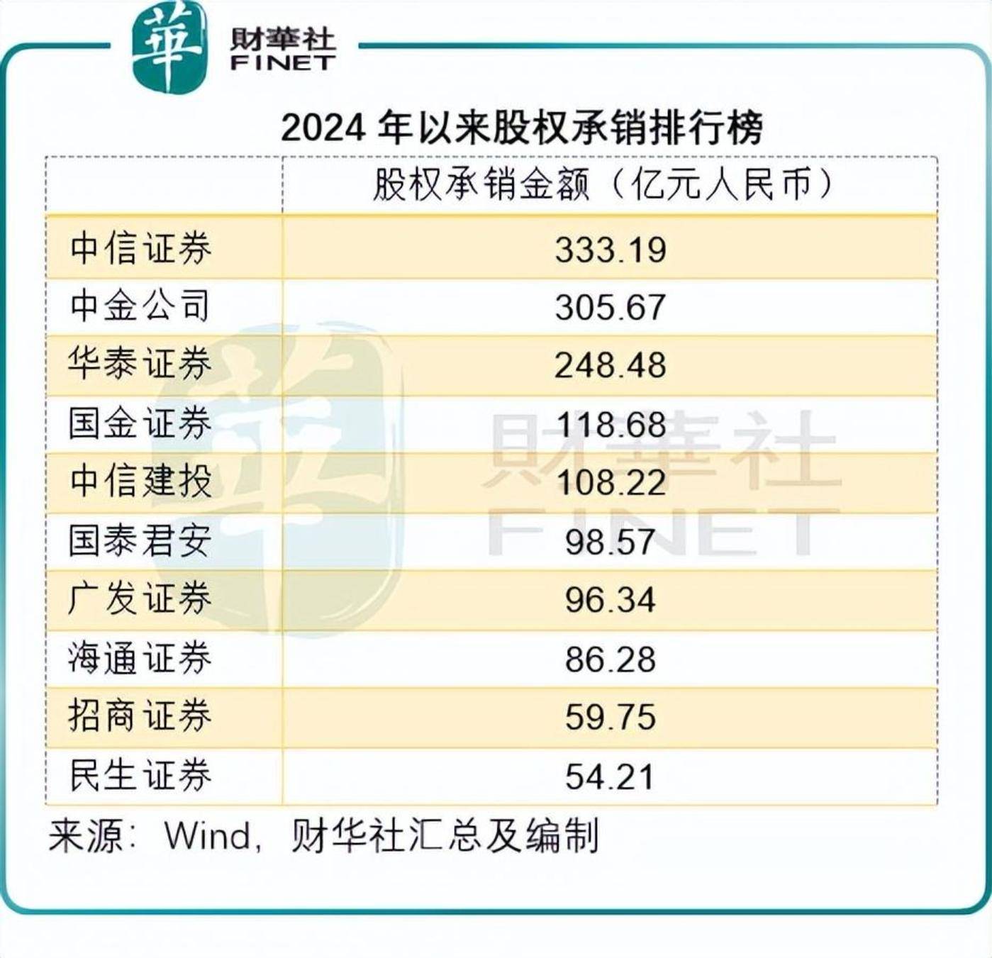 从 Wind 的数据来看,2024 年以来的股权承销榜中,中信证券和中金公司依然稳居第一和第二,股权承销金额分别达到 333.19 亿元和 305.67 亿元,第三为华泰证券,承销规模也达到 248.48 亿元。国泰君安和海通证券则分别排到第六和第八,今年以来的股权承销金额分别为 98.57 亿元和 86.28 亿元。