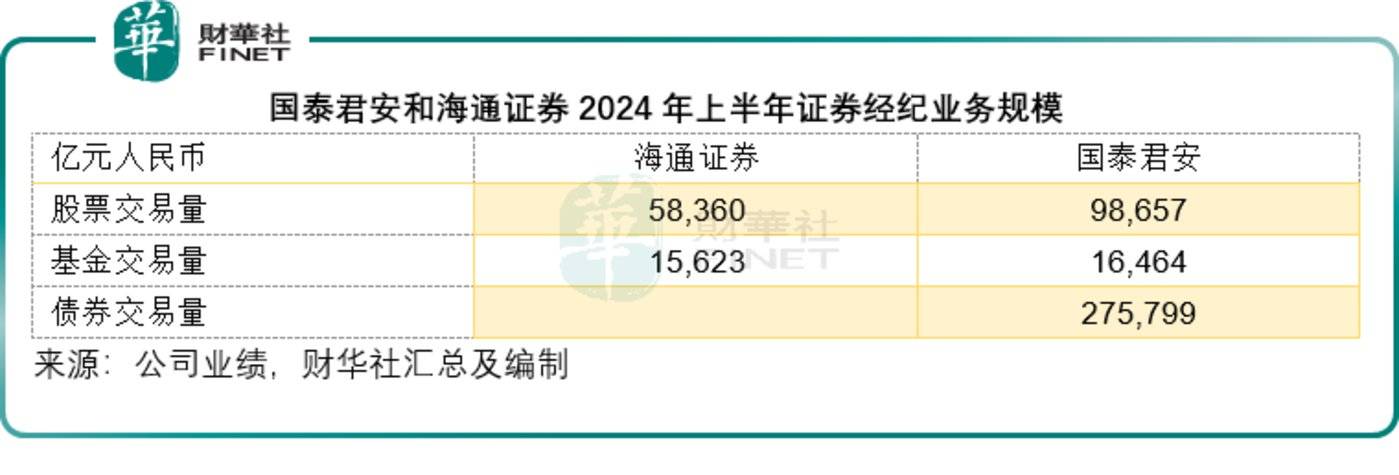 2024 年上半年,海通证券的股票交易量或为 5.8 万亿元,基金交易量为 1.56 万亿元,而国泰君安的股票交易规模或为 9.87 万亿元,证券投资基金的交易规模为 1.65 万亿元,其估算的市场份额分别为 4.92% 和 5.54%。若按此计算,两家券商的合并,股票和基金的交易市场份额或有望提高至 7.8% 和 10.8%。