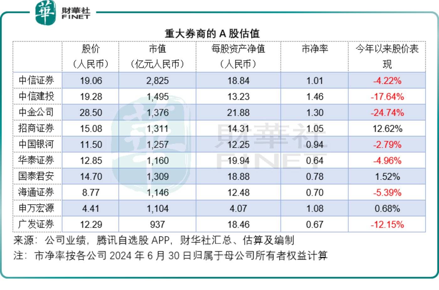 从估值来看,国泰君安和海通证券当前的股价均低于其资产净值,相对于其他千亿市值同行,存在较大的估值折让,且两家券商的市净率相若。