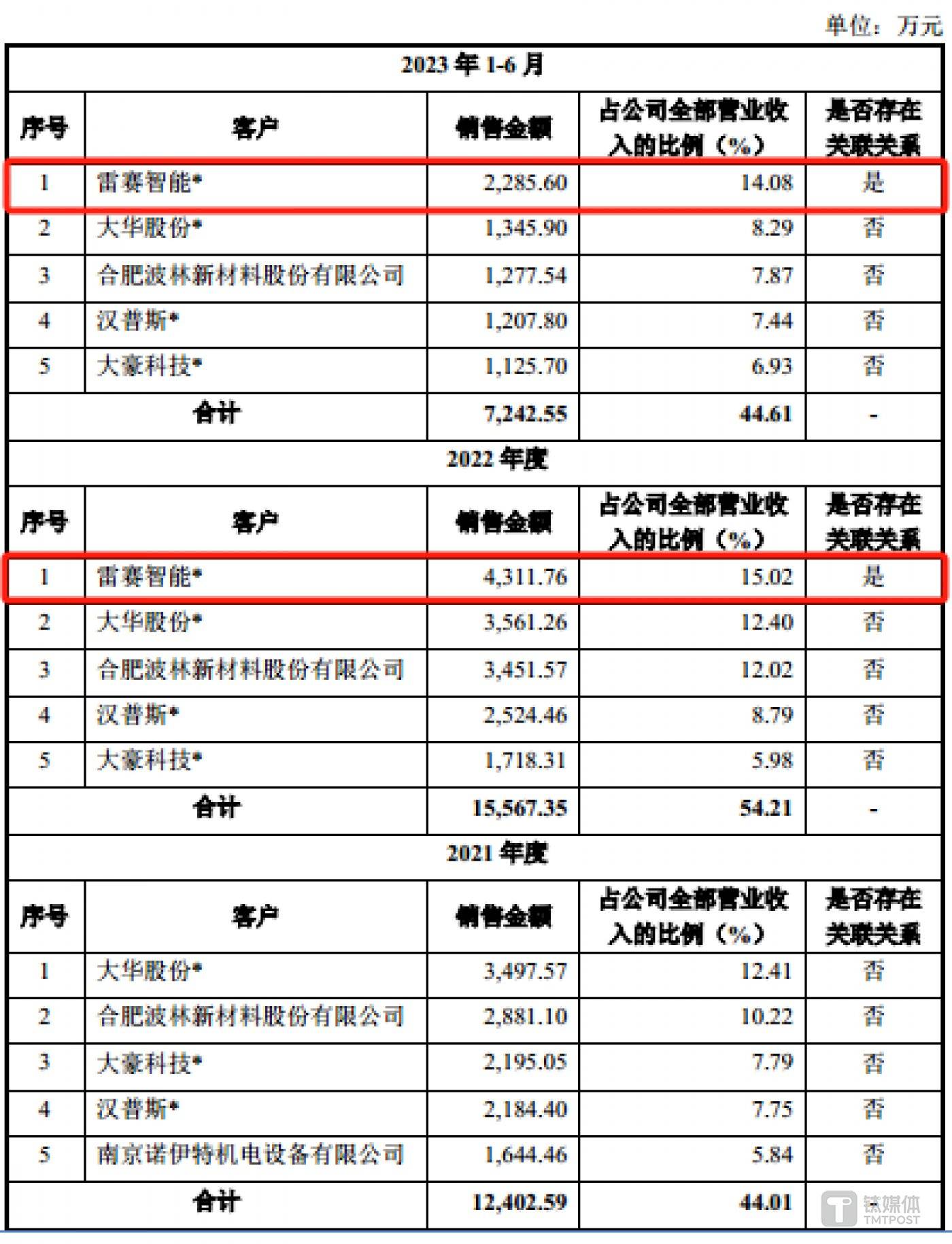 钛媒体 APP 梳理招股书发现,在 2022 年之前,雷赛智能从未出现在三协电机的前五大客户名单中,而在 2022 年通过稳正景明进入三协电机之后,开始稳居三协电机的第一大客户头衔。