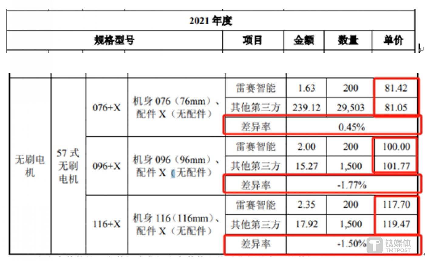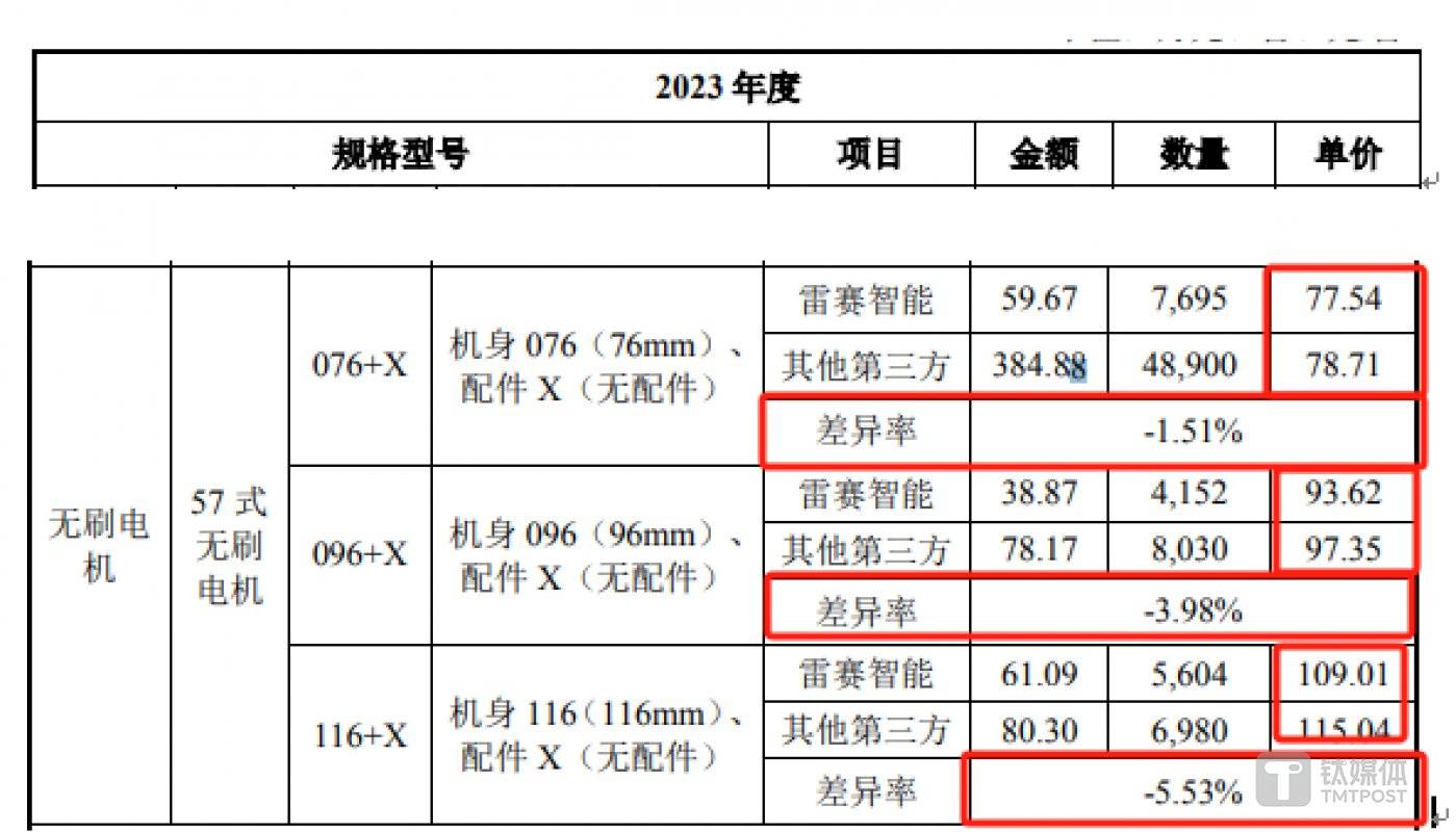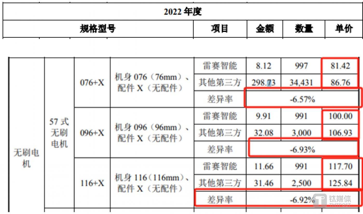 可见,在 57 式无刷电机方面,三协电机是让利给了雷赛智能,特别是规格为 076+X 型号的 57 式无刷电机,在雷赛智能还未入股前的 2021 年,该产品的销售单价高于第三方。而在 2022 年雷赛智能入股之后,该产品的销售单价一直低于第三方的采购价格。