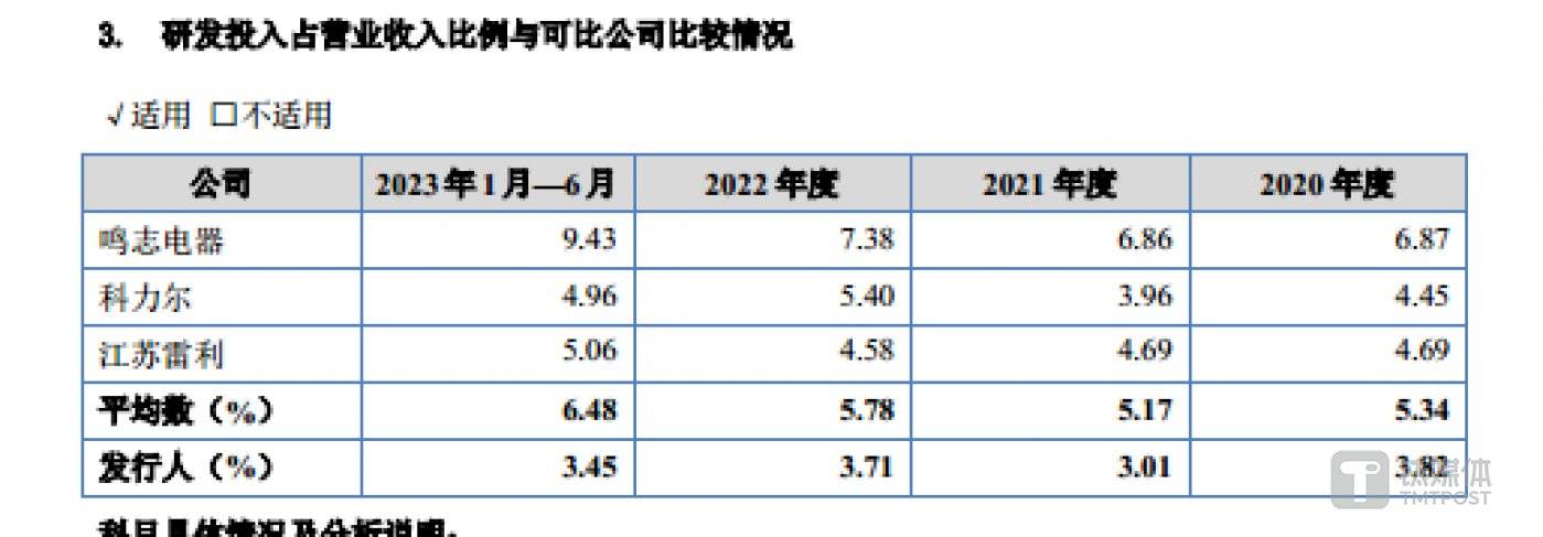 与此同时,报告期内,三协电机的研发费用率分别为 3.82%、3.01%、3.71%、3.45%,同行可比公司平均值分别为 5.34%、5.17%、5.78%、6.48%,研发费用率始终低于同行均值。