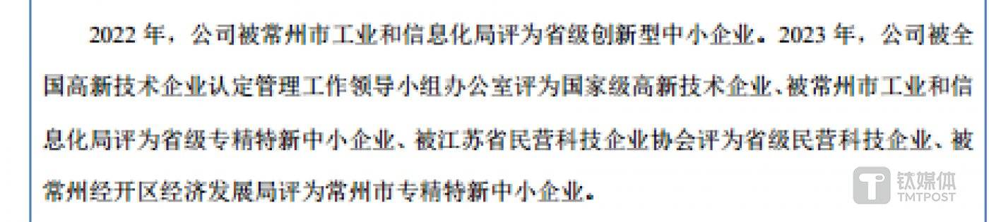 三协电机在申报稿中自述,「2022 年,公司被常州市工业和信息化局评为省级创新型中小企业。2023 年,公司被全国高新技术企业认定管理工作领导小组办公室评为国家级高新技术企业、被常州市工业和信息化局评为省级专精特新中小企业、被江苏省民营科技企业协会评为省级民营科技企业、被常州经开区经济发展局评为常州市专精特新中小企业。」