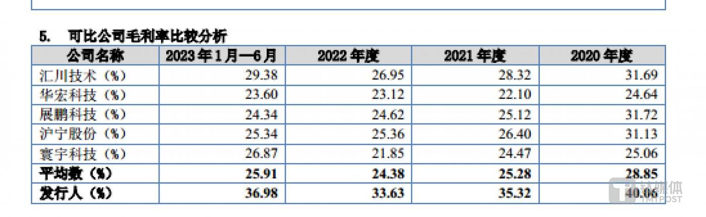 招股说明书显示,报告期内,伟邦科技的毛利率分别为 40.06%、35.23%、33.63%、36.98%,同行可比公司平均值分别为 28.85%、25.28%、24.38%、25.91%,毛利率长期高于同行均值 10 个百分点。