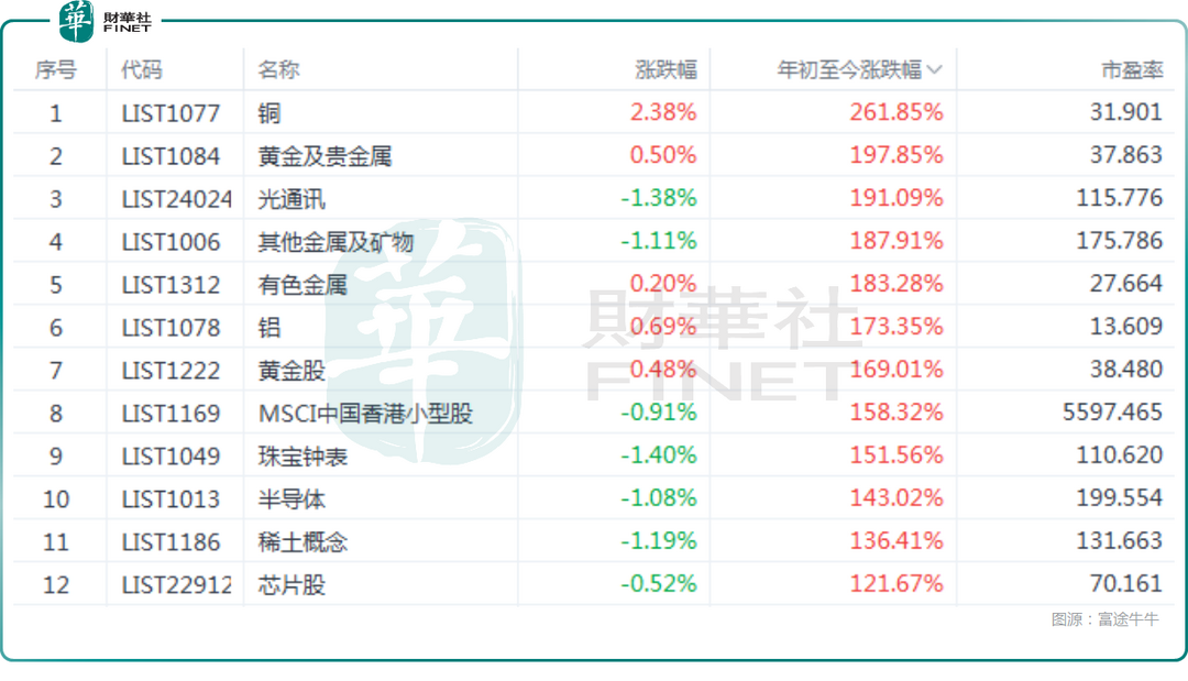 数据显示,截至 12 月 31 日,港股铜板块年内累涨261.85%,黄金及贵金属板块涨197.85%,其他金属及矿物板块涨187.91%,有色金属、铝、黄金股、稀土概念也都在年内实现翻倍上涨。