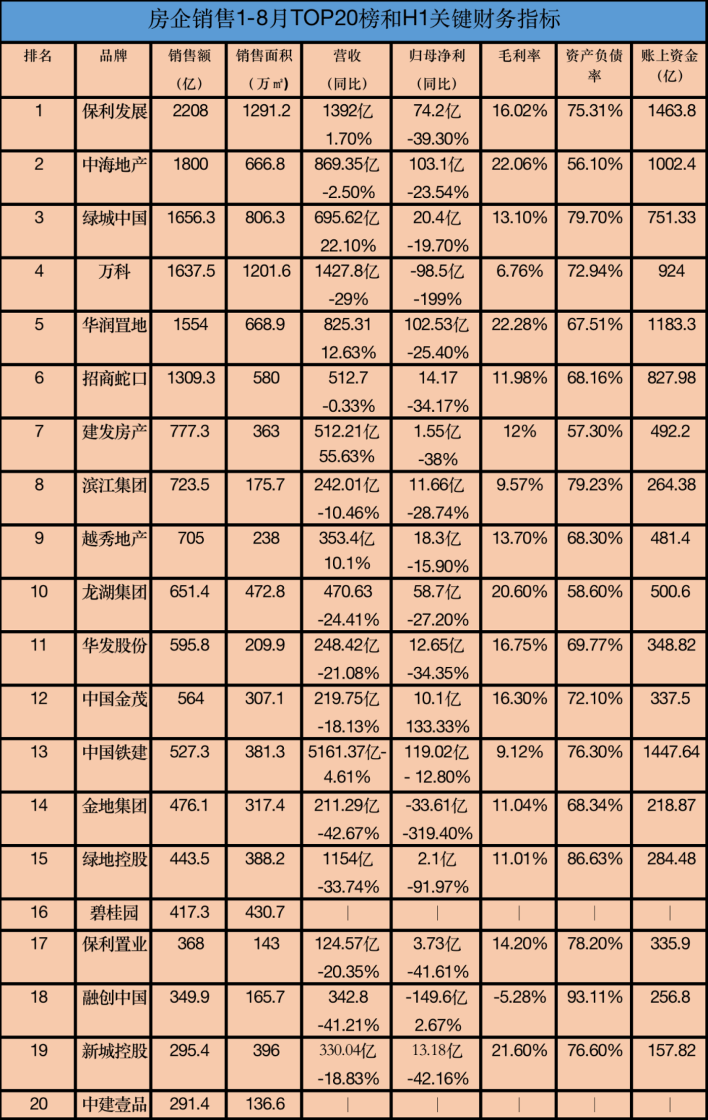 今年 1-8 月销售总额超千亿房企 6 家,较去年同期减少 6 家,百亿房企 61 家,较去年同期减少 29 家。保利发展、中海地产和绿城中国位列前三,销售额分别是 2208 亿元、1800 亿元和 1656.3 亿元。