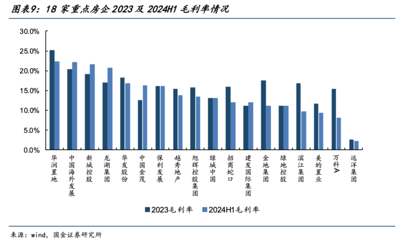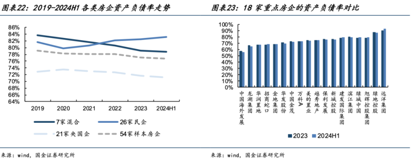 从资产负债率来看,在行业下行的背景下,多数房企选择稳健经营,2024 年上半年整体资产负债率为 76.8%,较 2023 年底下降 0.26 个百分点。