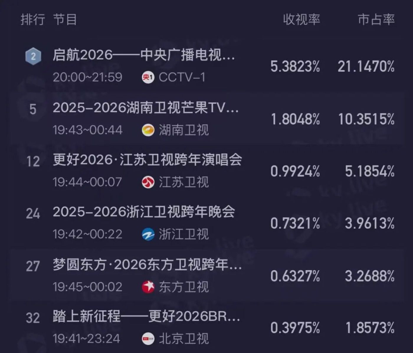 根据酷云数据,央视跨年晚会平均收视率达 5.38%,以断层优势领跑市场;湖南卫视跨年晚会则以 1.8% 的平均收视率名列第二,并蝉联省级卫视冠军。