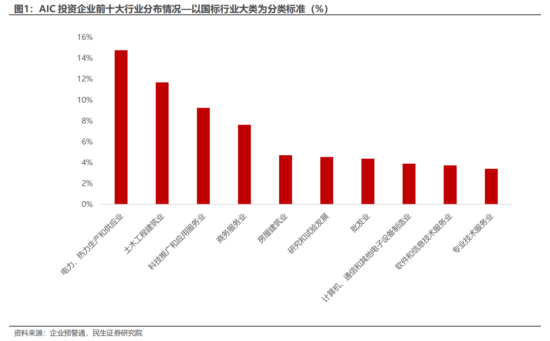 AIC 正逐步成为科技金融市场中重要的“ 耐心资本“。民生证券研究显示,截至 2025 年 10 月末,AIC 重点投资的领域聚焦在电力、热力生产和供应业、土木工程建筑业、科技推广和应用服务业等行业。在战略性新兴产业方面,可以看到 AIC 投资的企业主要集中在新能源产业、新一代信息技术产业、高端装备制造产业等。同时持股比例八成落在 50% 以内,近四成低于 5%,形成“ 分散布局+重点深耕” 的银行系“ 耐心资本” 新范式。