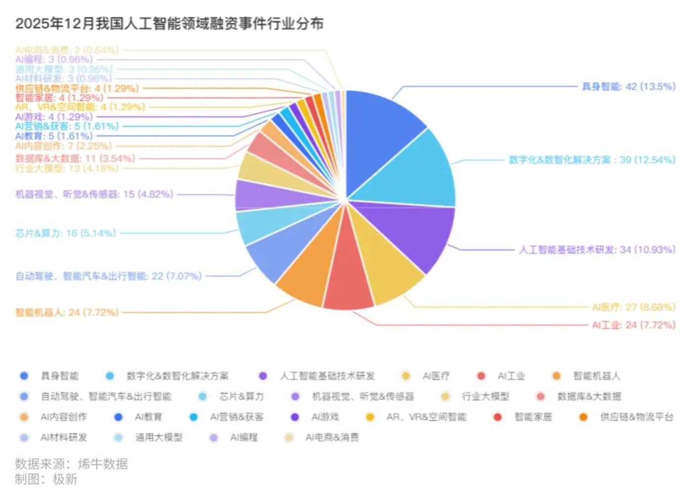 图二:2025 年 12 月我国人工智能领域投融资事件各细分行业统计 (数据来源:烯牛数据)
