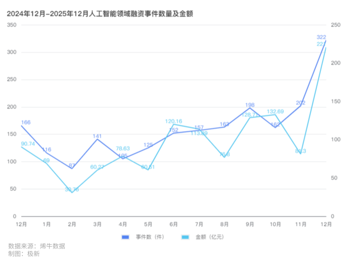 根据烯牛数据,2025 年 12 月我国人工智能领域共发生投融资事件 322 起,披露融资金额 221 亿元,位居全行业融资金额第二位,第一名为先进制造行业,共 294 亿元。(注:此处披露的融资金额总额为国内 (不包含港澳台) 投融资事件,不包含并购、IPO、IPO 以后阶段的投资事件)