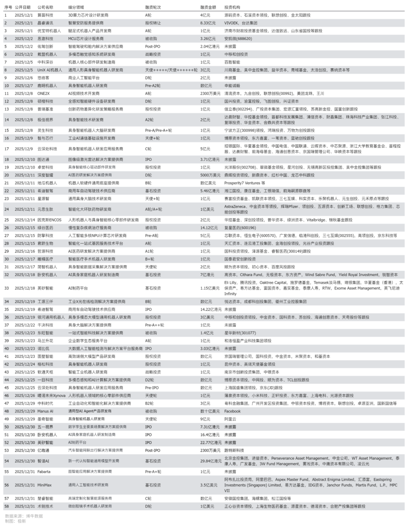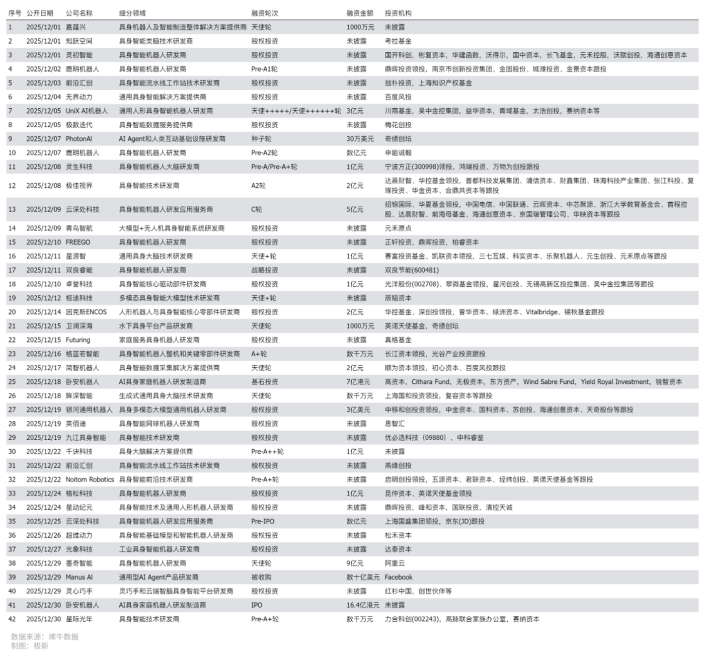 其中,12 月具身智能领域投融资事件共 42 起,相比 11 月增加 26 起。