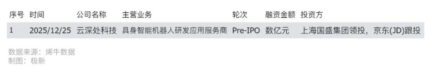 12 月发生 1 起 Pre-IPO 事件,12 月 25 日,杭州云深处科技股份有限公司完成数亿元人民币 Pre-IPO 轮融资。本轮融资,由国家人工智能产业基金领投,某互联网大厂跟投。