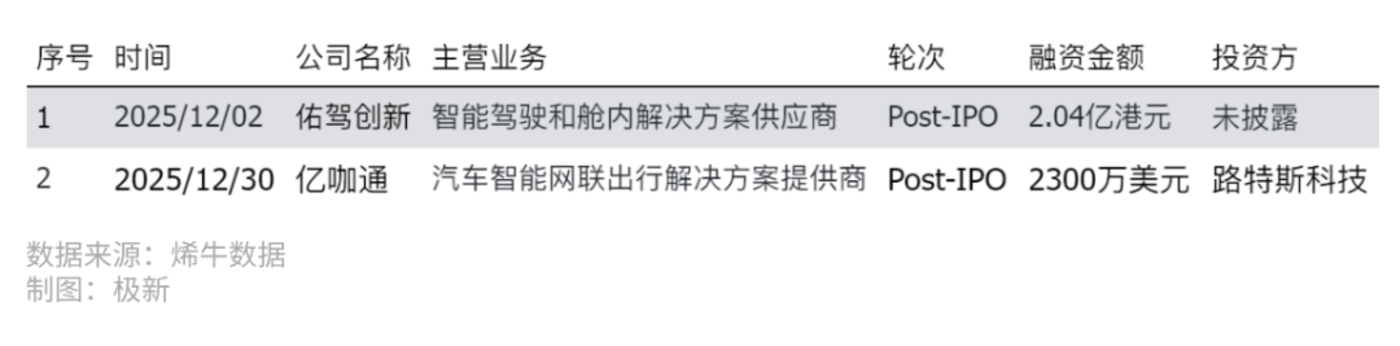 另外,12 月发生 2 起 Post-IPO 事件,12 月 2 日,佑驾创新此次募资净额为 2.09 亿港元,扣除发行费用后,募资净额为 2.04 亿港元。佑驾创新称,配售事项所得款项净额将主要用于集团 L4 无人物流车的业务发展及基础研发平台的升级。今年以来,佑驾创新持续发力做 L4 无人物流车,目前,佑驾创新无人小巴已在苏州、黑龙江、上海、杭州等多地投入常态化运营,并拓展至鄂州花湖国际机场等高门槛、高难度场景,展现出技术适配与工程化落地能力。