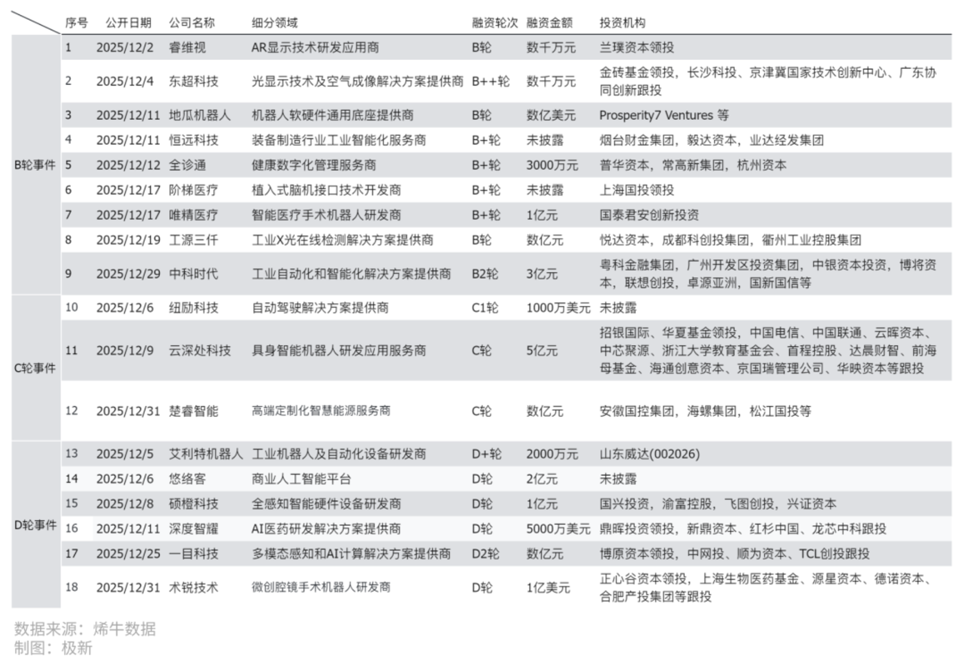 图三:2025 年 12 月我国人工智能-具身智能领域投融资事件统计 (数据来源:烯牛数据)