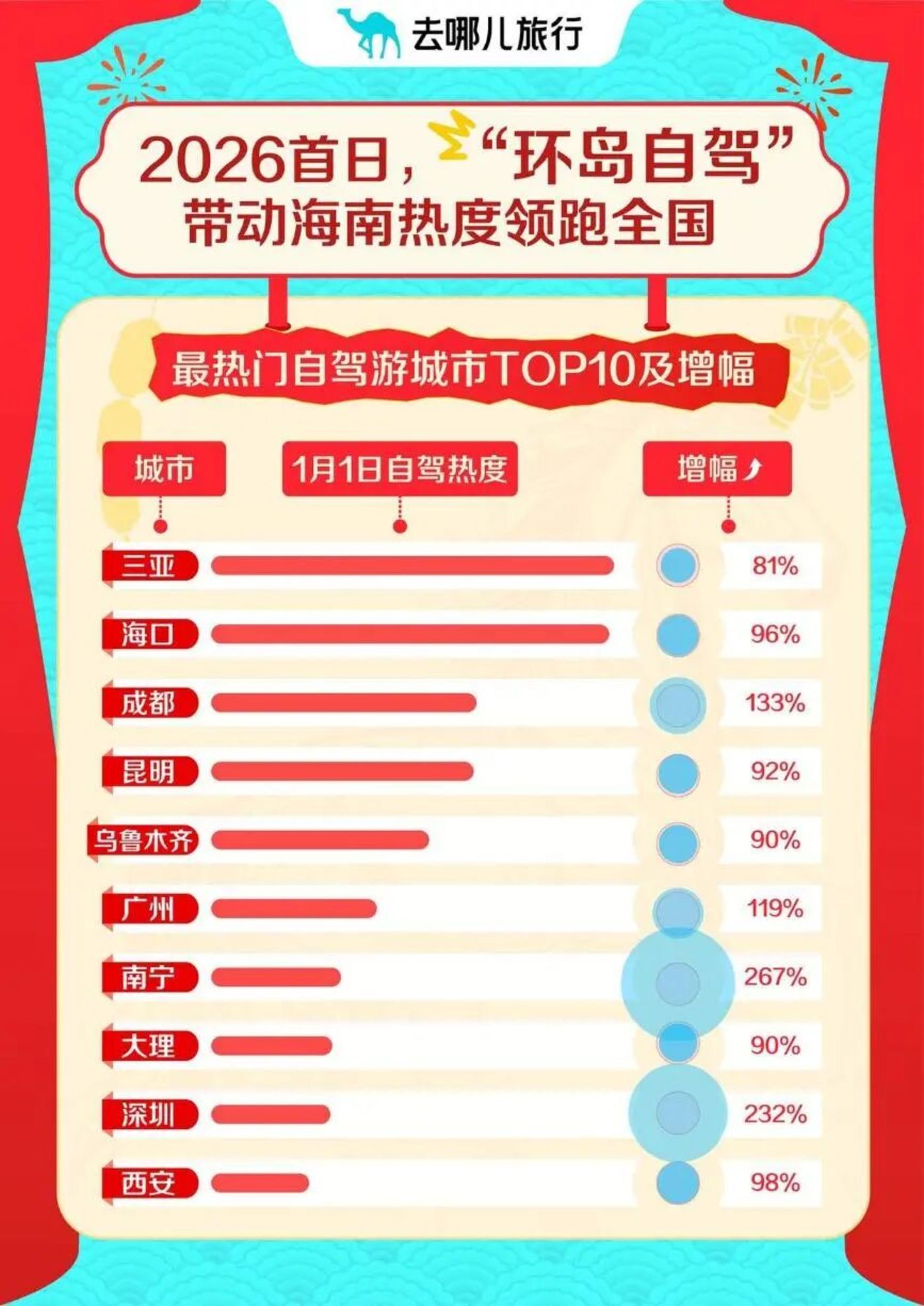 与北方冰雪的激情形成呼应,南方避寒游同样热度爆棚。马蜂窝 2026 国内跨年热门景区 TOP10 中,涠洲岛、南澳岛、沙面岛纷纷上榜,正值观鲸最佳时节的涠洲岛热度上涨 156%,许多游客希望以邂逅自然奇观的方式开启新一年。同程数据显示,婺源、无锡、南京、长沙、深圳等多个南方城市景区进入快年夜热度攀升最快 TOP10。此外海南作为传统避寒胜地,在全岛封关的利好加持下热度倍增,去哪儿数据显示,海口和三亚自驾游热度位列全国 TOP2,同比分别大幅增长 81% 和 96%,三亚国际免税城等商圈周边酒店入住量增幅均在 1 倍以上。