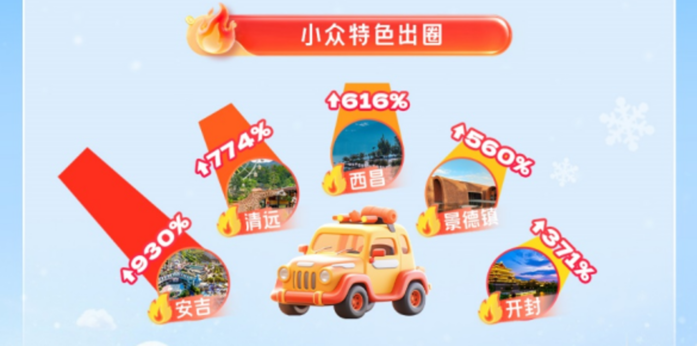 具体来看,Z 世代旅游商品预订量增长超 60%,消费重点在体验类产品,如滑雪课程、演唱会门票、非遗体验等;家庭客群的消费重点在住宿和餐饮,愿意为高星级酒店、亲子套餐支付溢价;中老年客群则更偏好康养类产品,如温泉民宿、慢节奏的小城度假等。同时,「反向旅游」 的红利持续释放,部分游客为避开人潮,选择前往小众县城,追求高性价比的 「烟火气」 体验,云南普洱、广东清远等小城的热度提升正是这一趋势的体现。