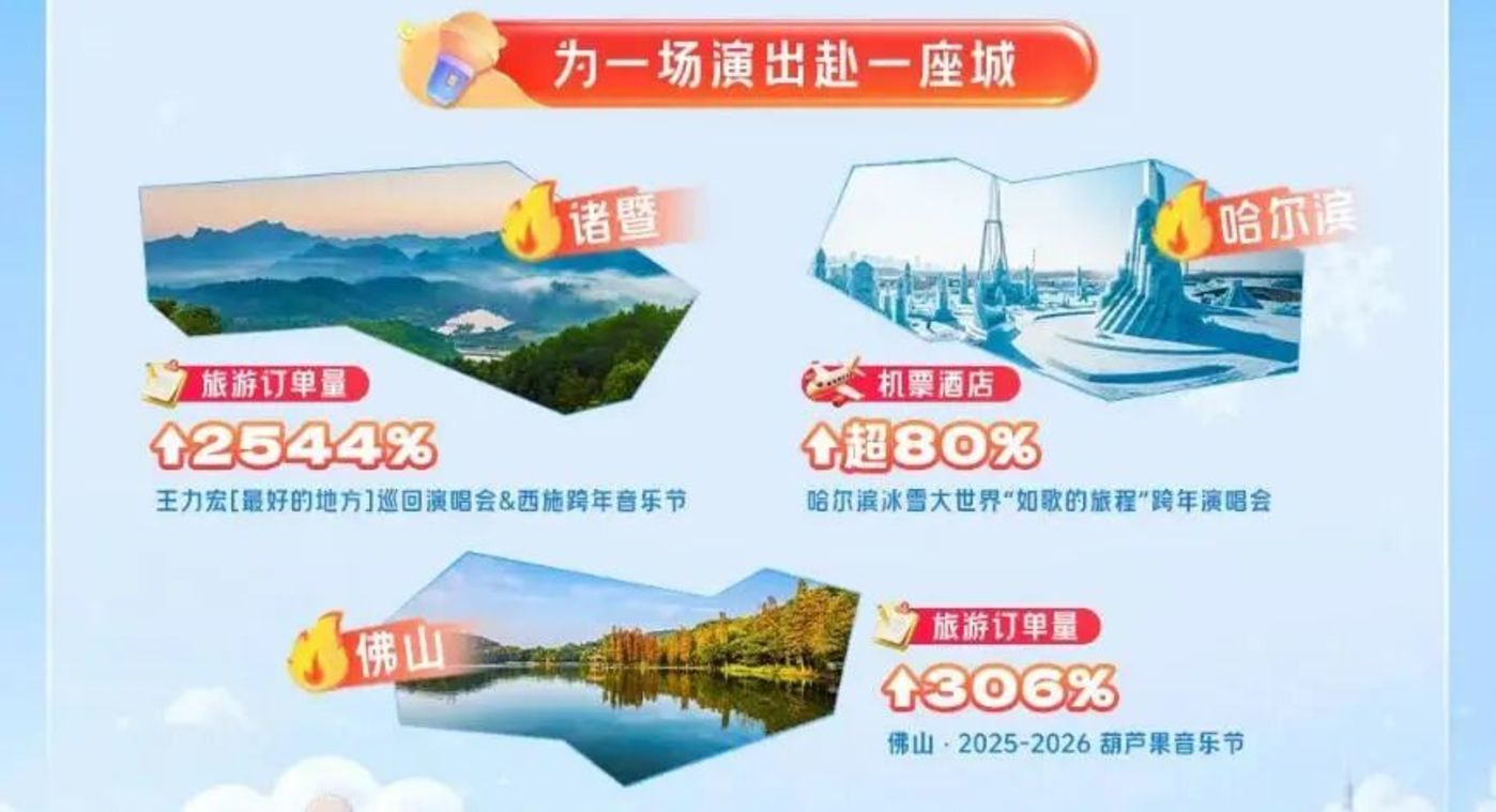 演出经济成为拉动旅游的重要引擎,「为一场演出赴一座城」 成为年轻群体的新消费模式。哈尔滨凭借 「如歌的旅程」 跨年演唱会,带动机票预订增长 82%,酒店预订提升 81%;浙江诸暨因演唱会及西施跨年音乐节,旅游订单增长 2544%;南宁、佛山、沈阳等举办跨年演出的城市,旅游订单均实现翻倍增长。美团旅行数据显示,12 月中旬以来,「跨年烟花秀」「跨年演唱会」「跨年篝火露营」 等 「跨年追光」 玩法搜索量上涨均超过 500%,「跨年无人机倒计时」 等科技感十足的 「赛博跨年」 搜索量也增长迅猛。
