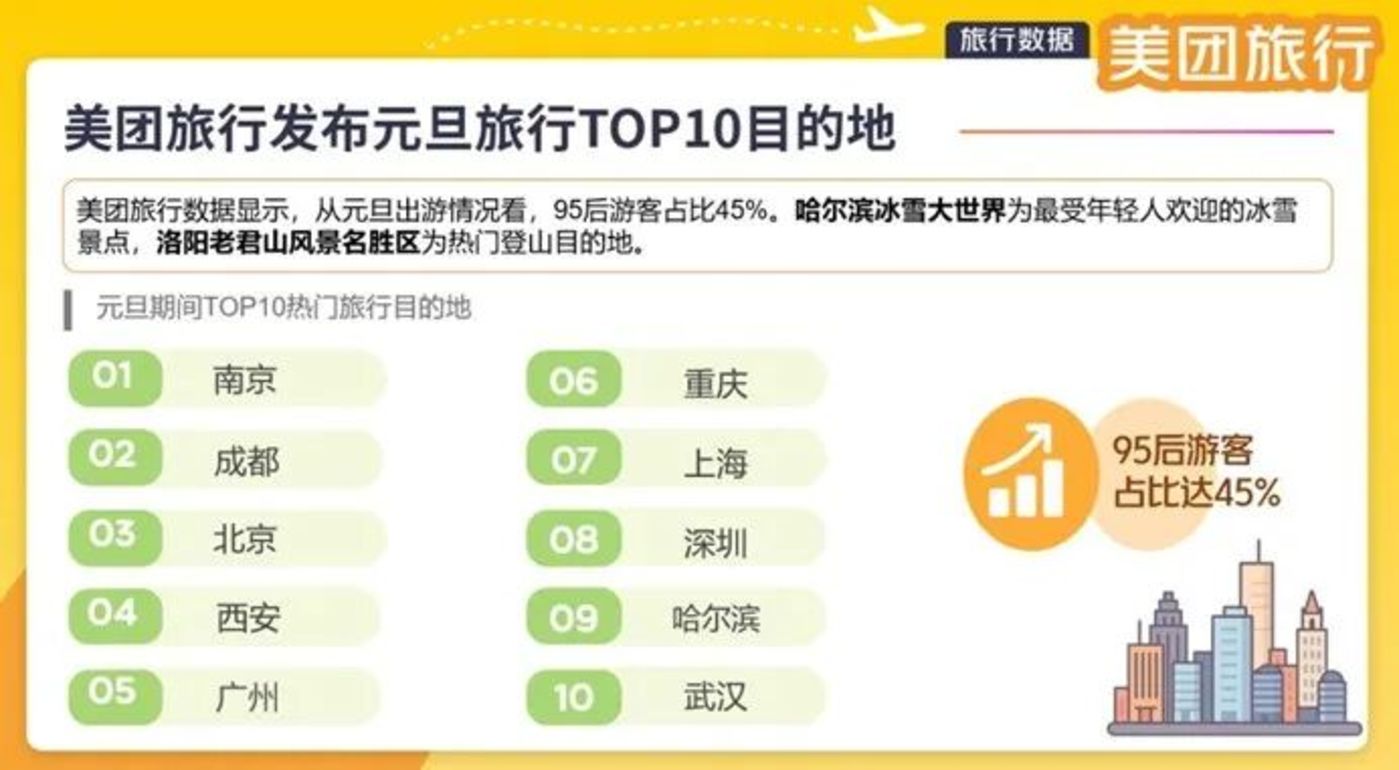 哈尔滨位列热门旅行目的地 TOP10 城市,其中冰雪大世界最受年轻人欢迎,来源美团 2026《元旦旅行 TOP10 目的地》