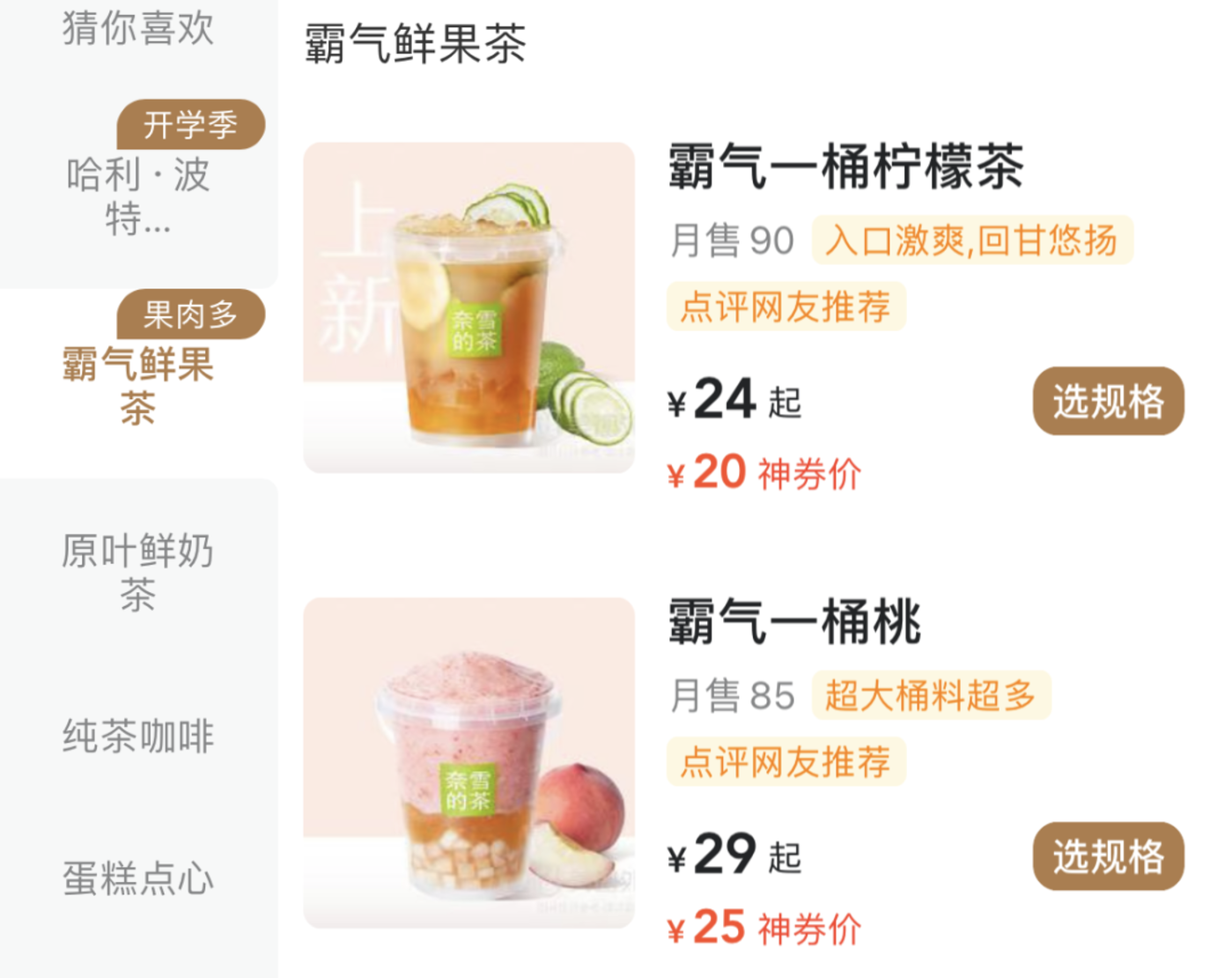 年轻人对大包装的爱催生了更多的大包装产品,「吨吨桶」 也成了茶饮品牌获取流量的固定玩法。究其原因,性价比可能是最主要的因素,正如网友们所调侃的一样:「不是小瓶买不起,而是大瓶更有性价比。」 以奈雪的茶的 「霸气一桶桃」 为例,1L 装的 「霸气一桶桃」 标准杯 29 元,500ml 装的中杯 「霸气水蜜桃」 标准杯 20 元,这么看的话,大瓶装性价比真的高很多。