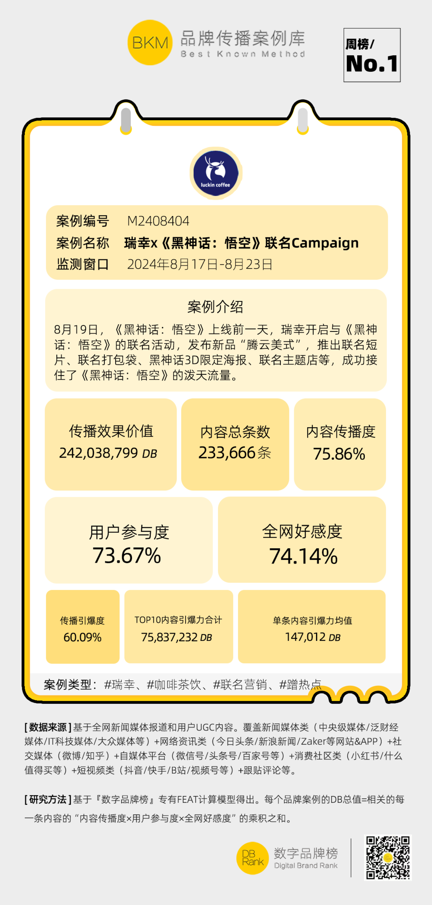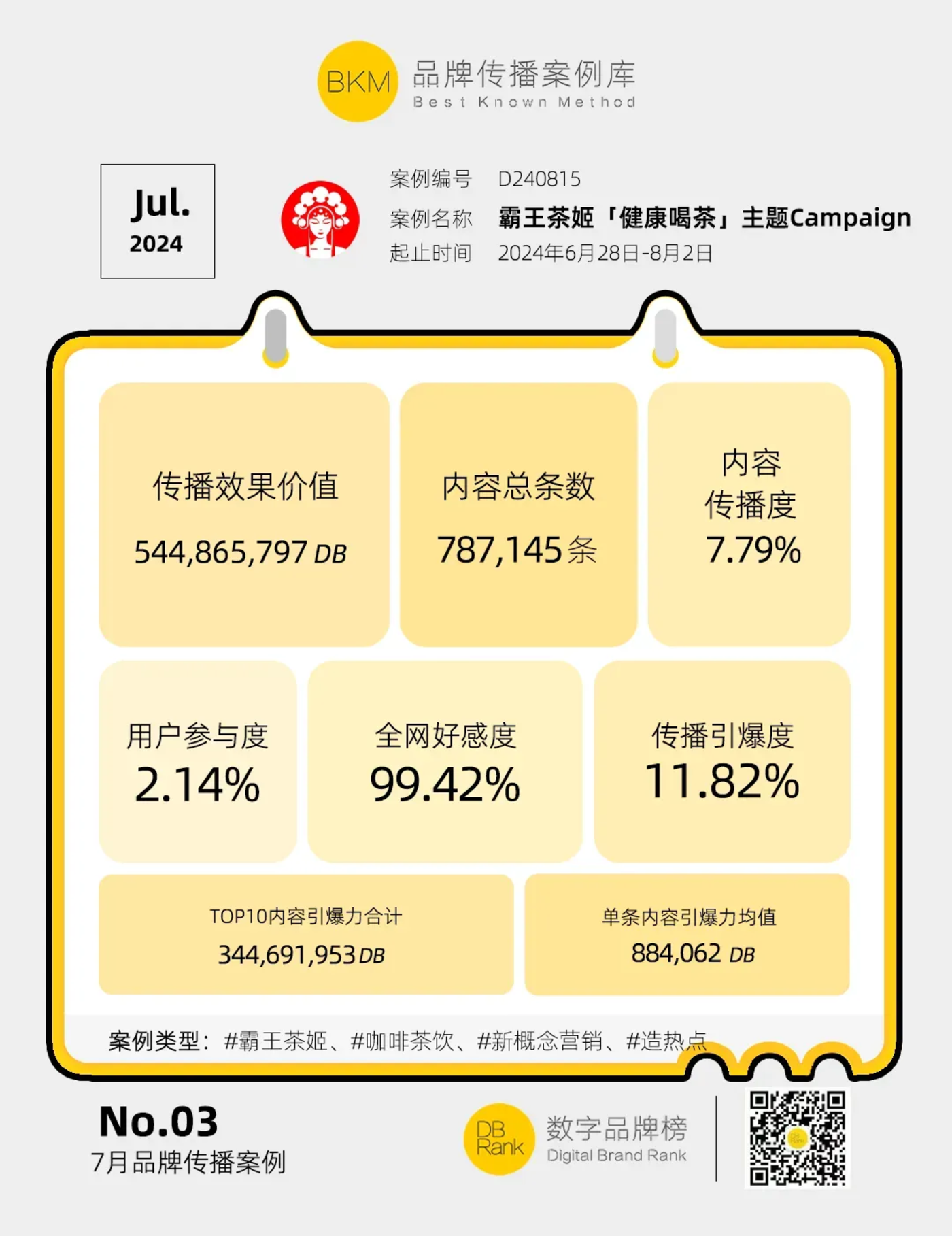 一方面,关于健康的 「新概念营销」 成为出圈利器。6 月 28 日,霸王茶姬宣布在全国超 4860 家门店全面上线 「营养选择」 标识,成为全国首个使用营养分级系统的茶饮品牌,在网上引起热议。根据 『数字品牌榜』监测,以 6 月 28 日-8 月 2 日为数据时间窗口,霸王茶姬 「健康喝茶」 主题 Campaign 获得数字品牌价值 544,865,797 DB,在 7 月 『数字品牌榜』 所研究的案例中排名第三,全网好感度达 99.42%,共促动 15,708,092 人参与,案例详情请点击 《昨日重现,这回轮到霸王茶姬押对宝了 | BKM 案例库 D240815》。喜茶也不甘落后,前几天,喜茶宣布推出 「咖啡因红绿灯」 健康标识,对在售 30+产品咖啡因含量进行分级公示,再一次在社交平台上引起广泛讨论。