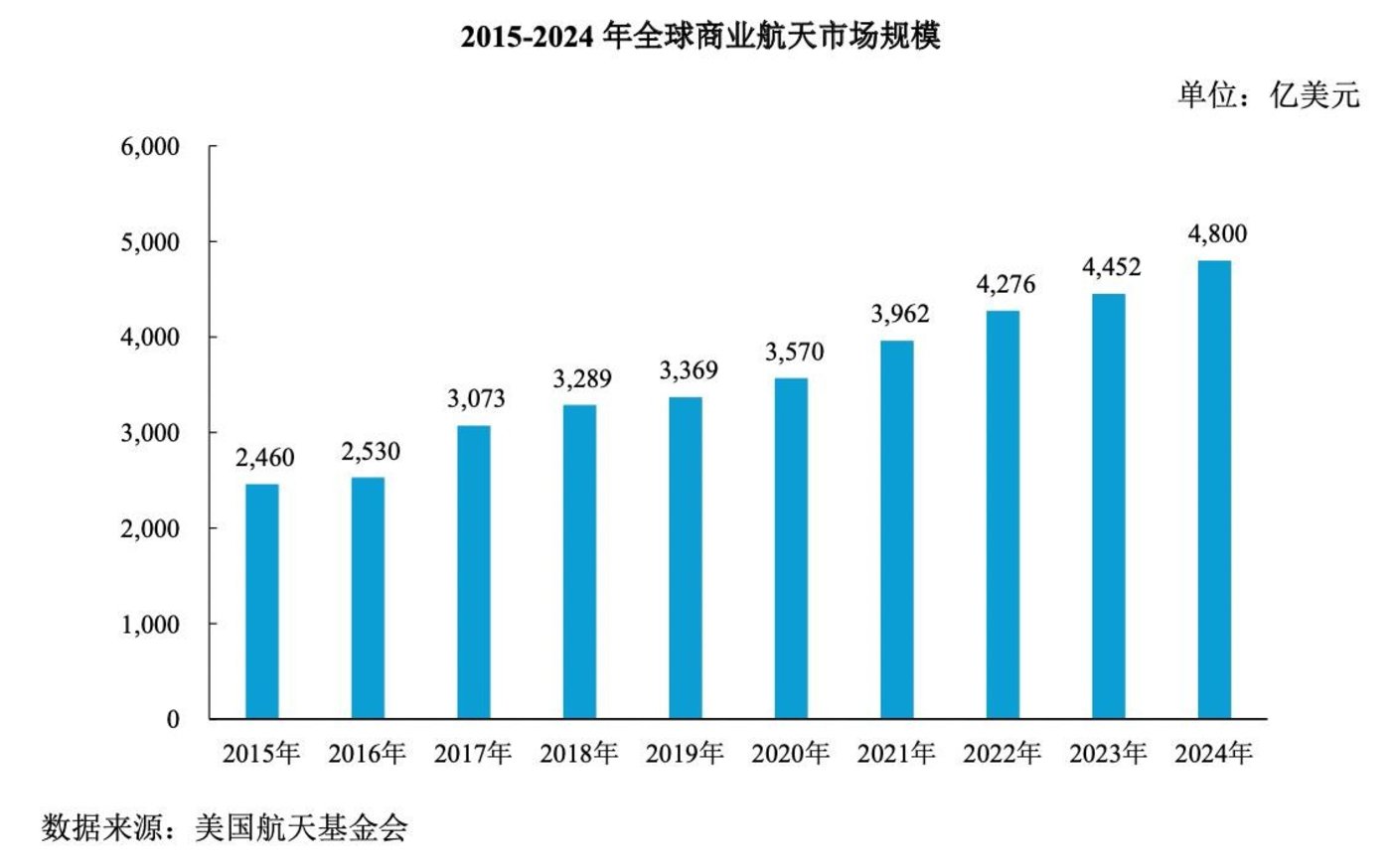 美国航天基金会 2025 年发布的 《航天报告》 显示,2024 年全球航天经济规模已经达到 6120 亿美元,其中商业航天收入为 4800 亿美元,占比 78%。