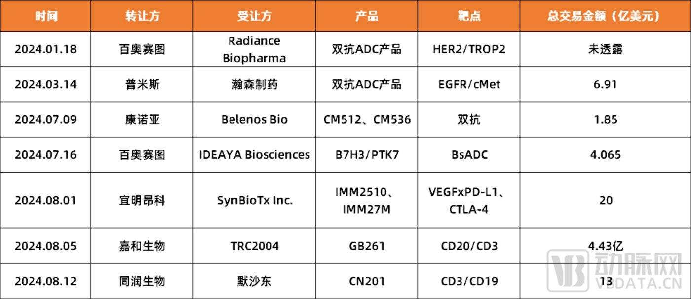 但进入 2024 年,风向似乎发生了变化。今年以来,国内已有 7 家药企完成了双抗药物授权交易,尤其是在自进入下半年以来,国产双抗出海更是呈现出了爆发趋势,近期,包括康诺亚、宜明昂科、嘉和生物以及同润生物在内的公司均实现了密集出海,这与前两年 MNC 扫货中国 ADC 如出一辙。