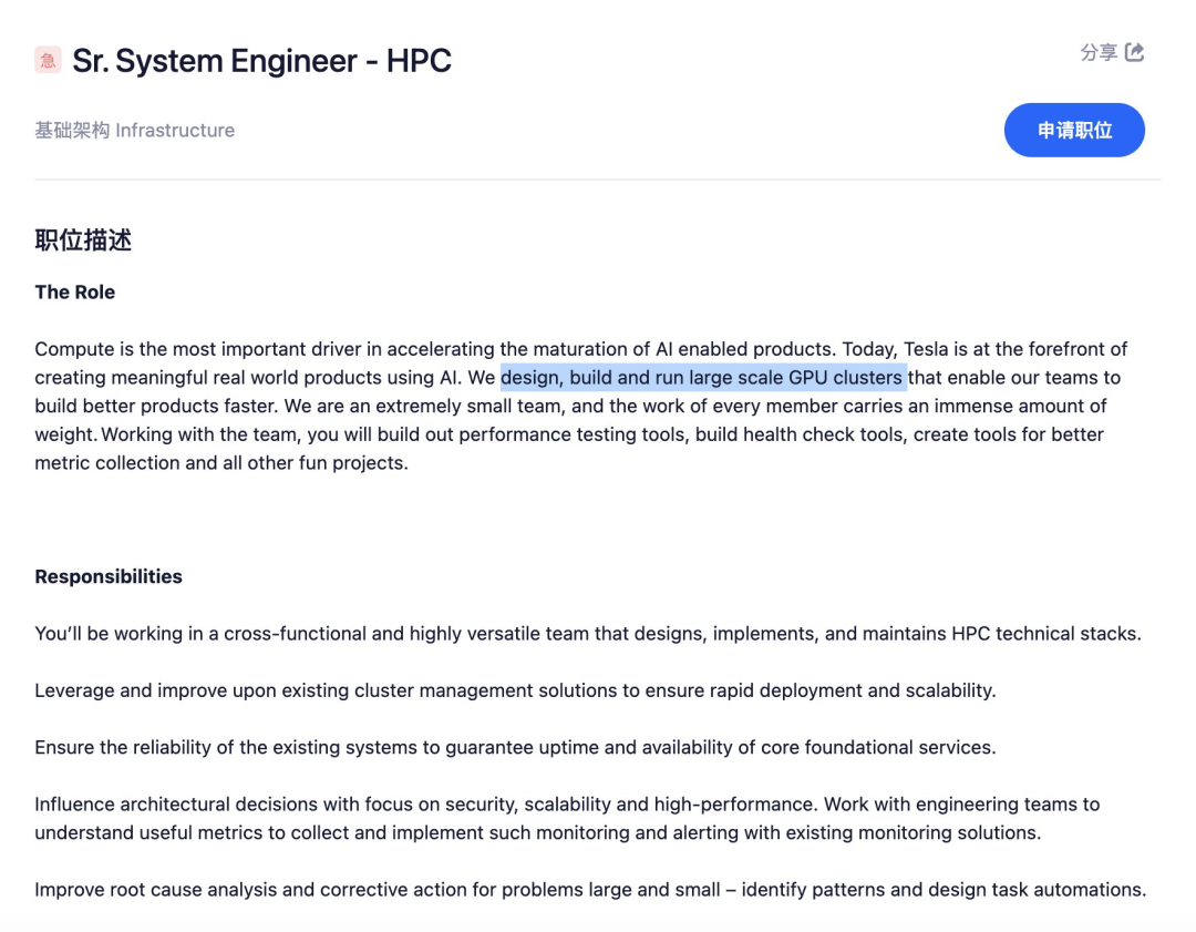 特斯拉中国突然刊登了一则“ 高级 HPC 系统工程师” 的招聘启事。这个职位工作地点在上海,它的职责是要建设并维护下一代特斯拉数据中心。