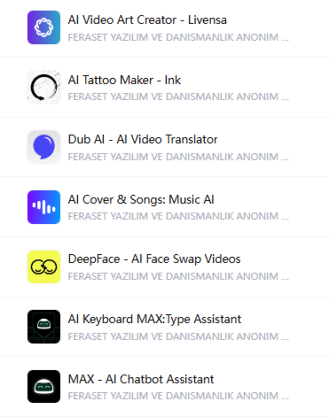 Livensa 的背后公司是一家专注于 AI 产品的公司 FERASET,且涉及场景广泛,自去年以来,上线了与 AI 相关的聊天机器人、翻译、换脸、音乐及纹身制作等等应用,都是当前比较火热的赛道,将追逐风口发挥到极致。