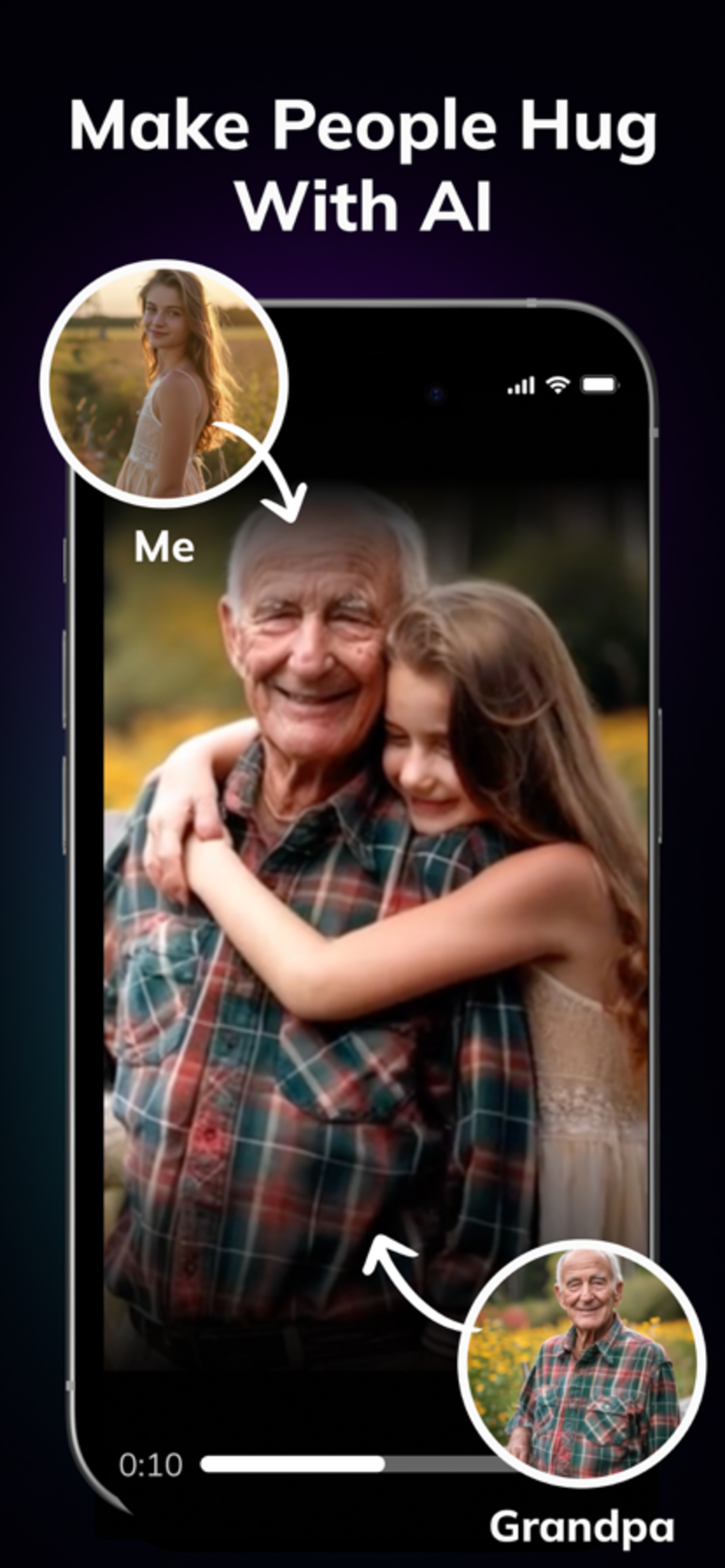 例如,分别上传小女孩和爷爷站在同一花丛中的两张单人照,输入文字 「Make People Hug With AI.(用 AI 让人们拥抱。)」 便可以得到一段女孩在花丛中抱着爷爷的视频。