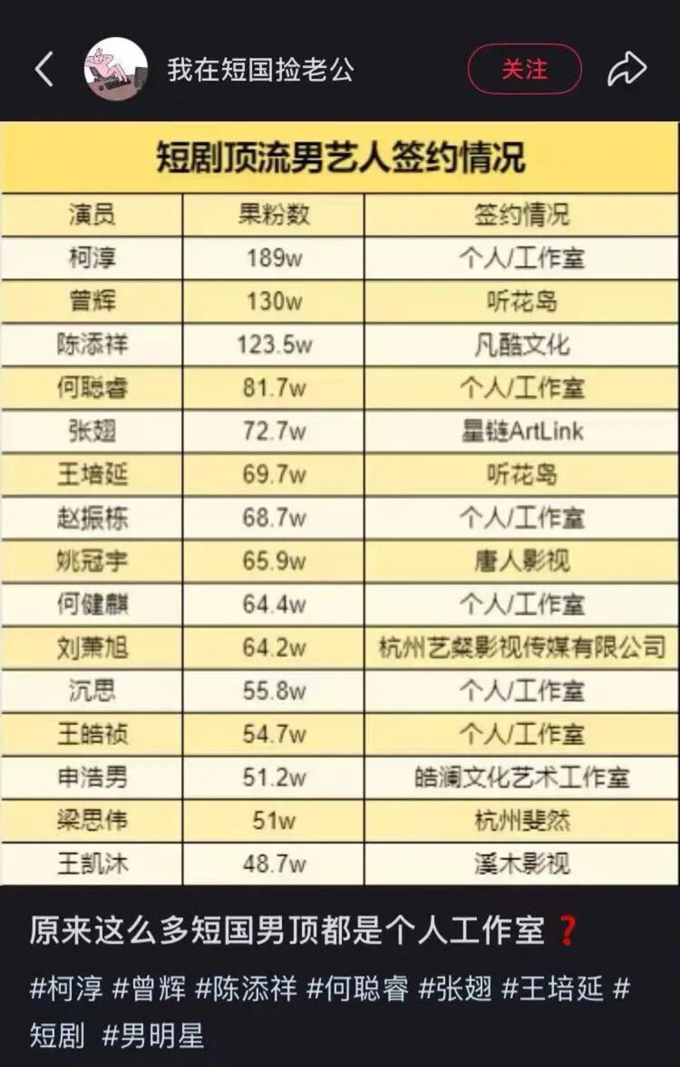 小红书博主统计的短国男演员经纪约归属