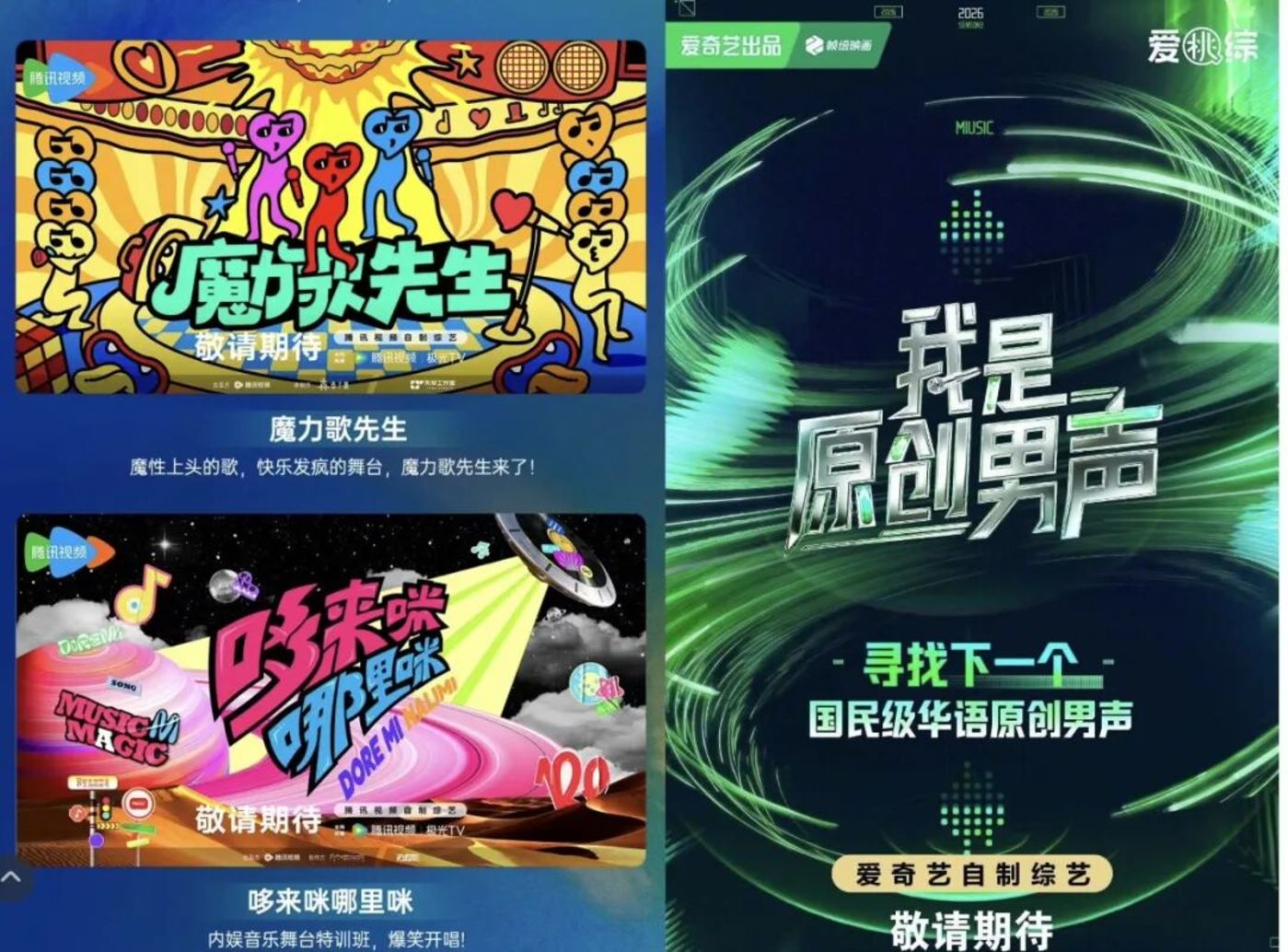 《我是原创男声》《超燃青春的合唱》《说唱巅峰对决 2026》《超感星电音》《繁星少年音乐会》《魔力歌先生》 等待播音乐综艺,或深耕垂类赛道,或融合多元元素,具体效果仍需时间与观众检验。