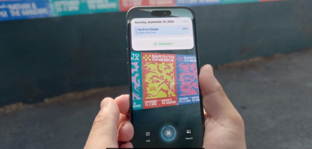 又比如,当用户在街边看到了一副感兴趣的活动海报,同样是按下 「相机控制」 按键后,Apple Intelligence 就可以自动将海报中的活动时间、地点等信息添加到日历应用中。