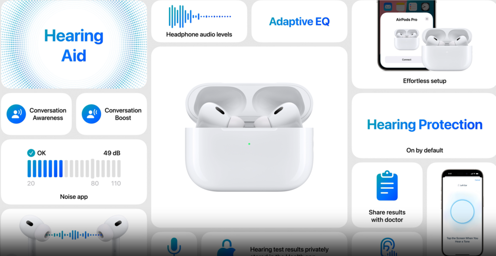 本场发布会上,苹果宣布后续将对 AirPods 进行一次 「史诗级的软件更新」:其更新后的新增功能包括听力保护、听力测试,甚至还支持临床等级的助听器功能。