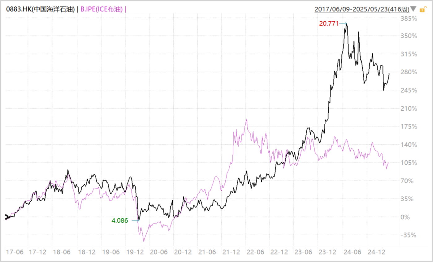 ▲中国海油 VS ICE 布油走势图,来源:Wind