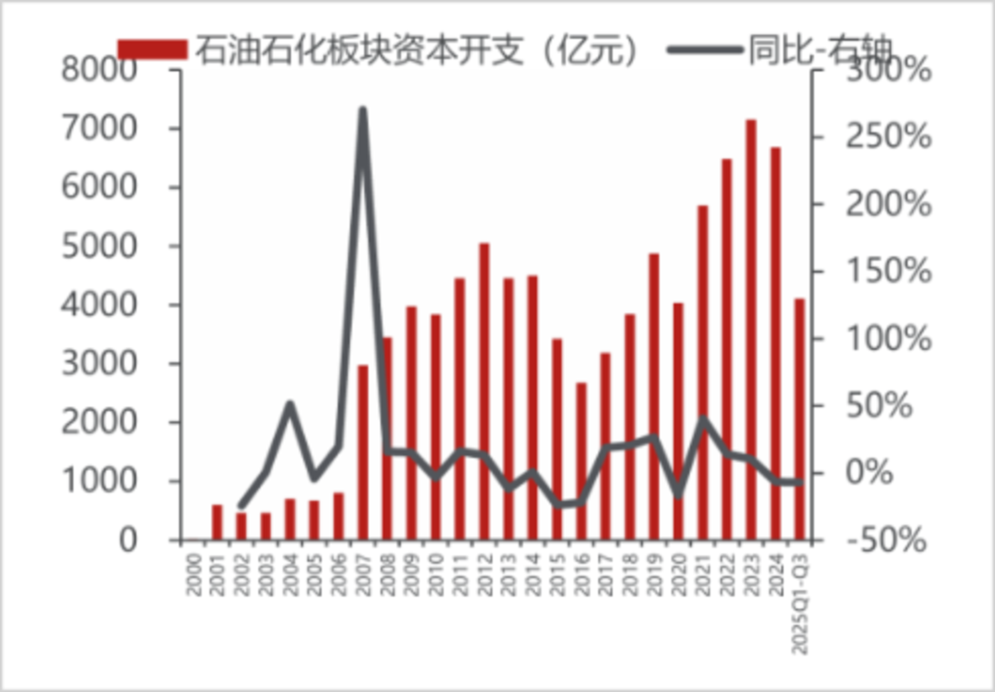 2025 年前三季度,石油石化、基础化工板块的资本支出增速分别为-6.8%、-8.6%,2024 年全年已同比下滑 6.6%、15%。相比之下,2022-2023 年因全球供应链扰动,资本支出曾连续两年实现双位数高增长。