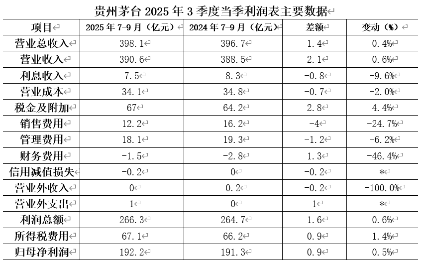 图:贵州茅台 2025 年 3 季度当季利润表主要数据,数据来源:Wind,公司公告