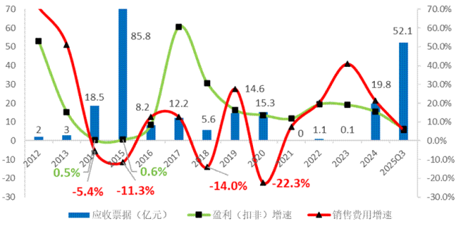 图:贵州茅台 2012-2025 年盈利、销售费用增速、应收票据对比图,数据来源:Wind,公司公告