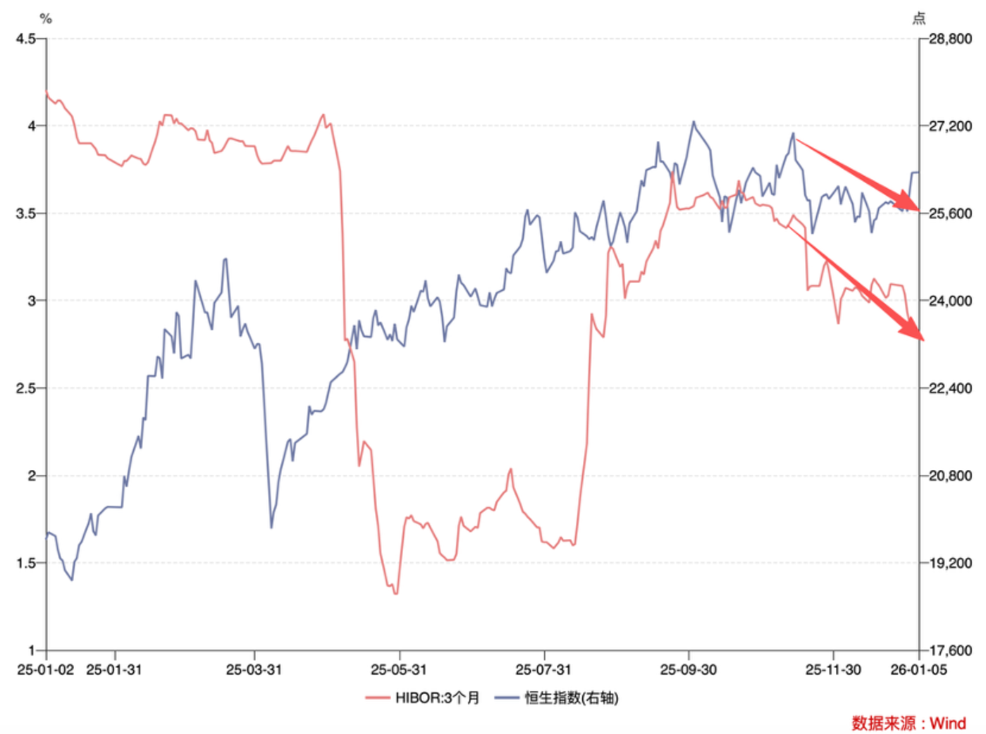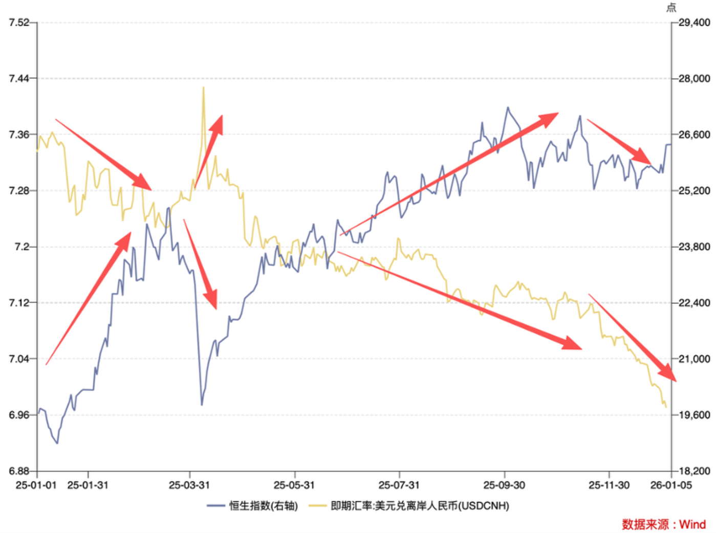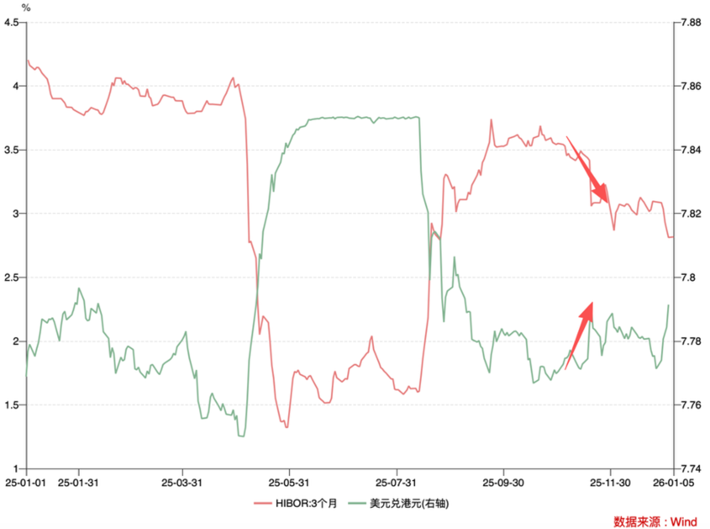 我们用 HIBOR,离岸人民币汇率,港元兑美元汇率等指标反复求证,并进行交叉验证,都在指向:2025 年末有一轮比较明显的资金在流出香港,其反应机制如下图。