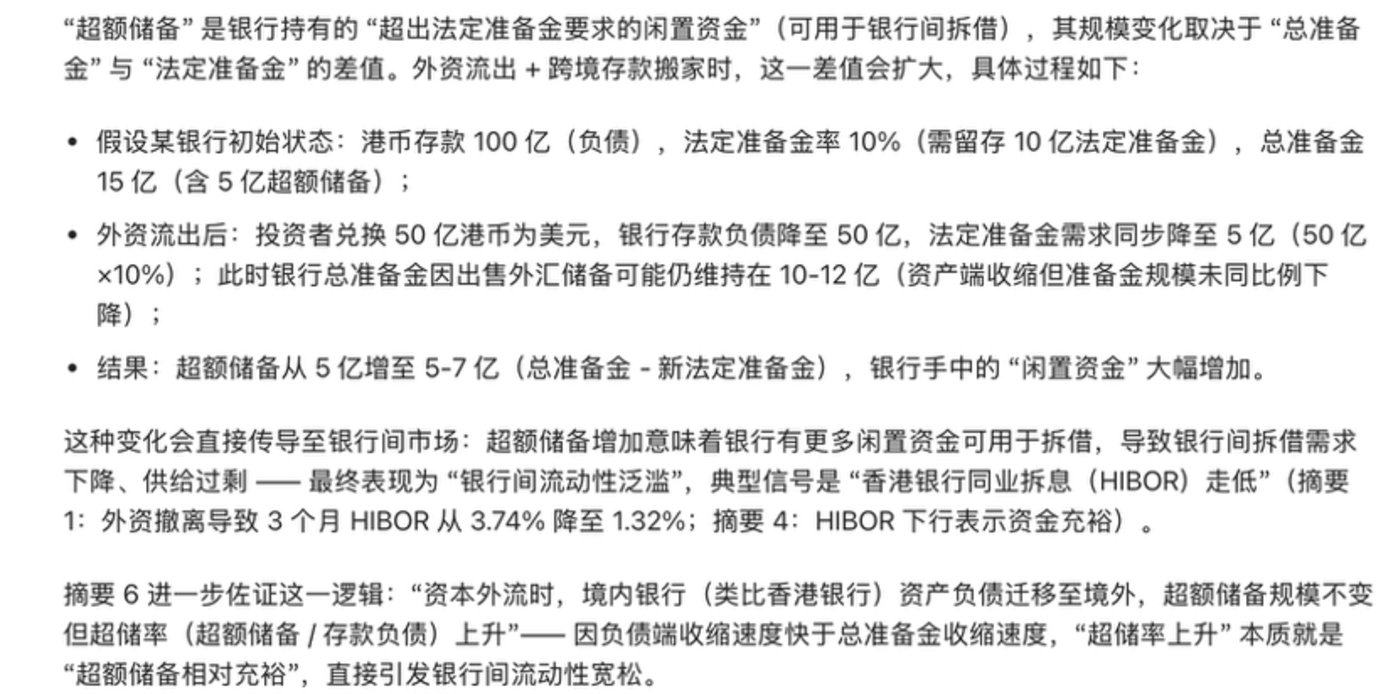 此时我们应该摒弃教科书的刻板印象,找到 HIBOR 下降的真正原因:并非因为流动性改善,而是存款搬家。此部分 AI 阐释的比我讲的清楚,贴在下面。
