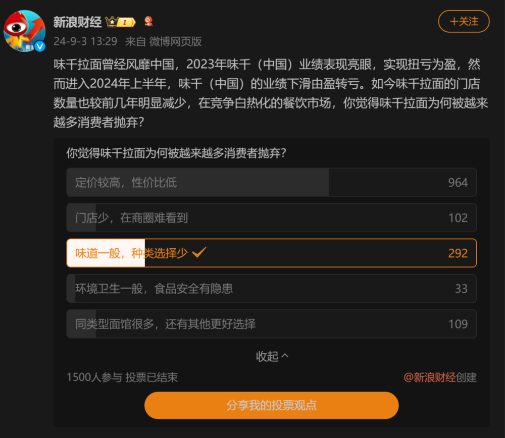 消费者正在抛弃这个初代网红品牌。在新浪财经发起的投票中,近 65% 投票网友认为味千拉面 「定价较高,性价比低」,此外还有近 20% 的投票网友认为味千拉面 「味道一般,种类选择少」。