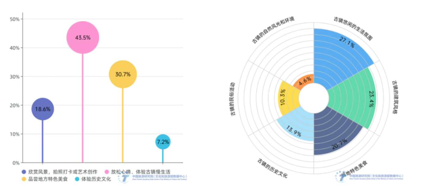 与此同时,尽管游客吐槽古镇过度商业化和同质化,但 《2024 年古镇旅游发展报告》 显示,最吸引游客的因素恰恰是 「悠闲的生活氛围」(27.1%),其次是建筑风格 (23.4%) 与特色美食 (20.7%),而历史文化、民俗活动等更深层的元素反居其后。游客前往古镇的主要目的,集中在 「放松心情、体验慢生活」(43.5%)、「品尝地方美食」(30.7%) 和 「拍照打卡」(18.6%)。