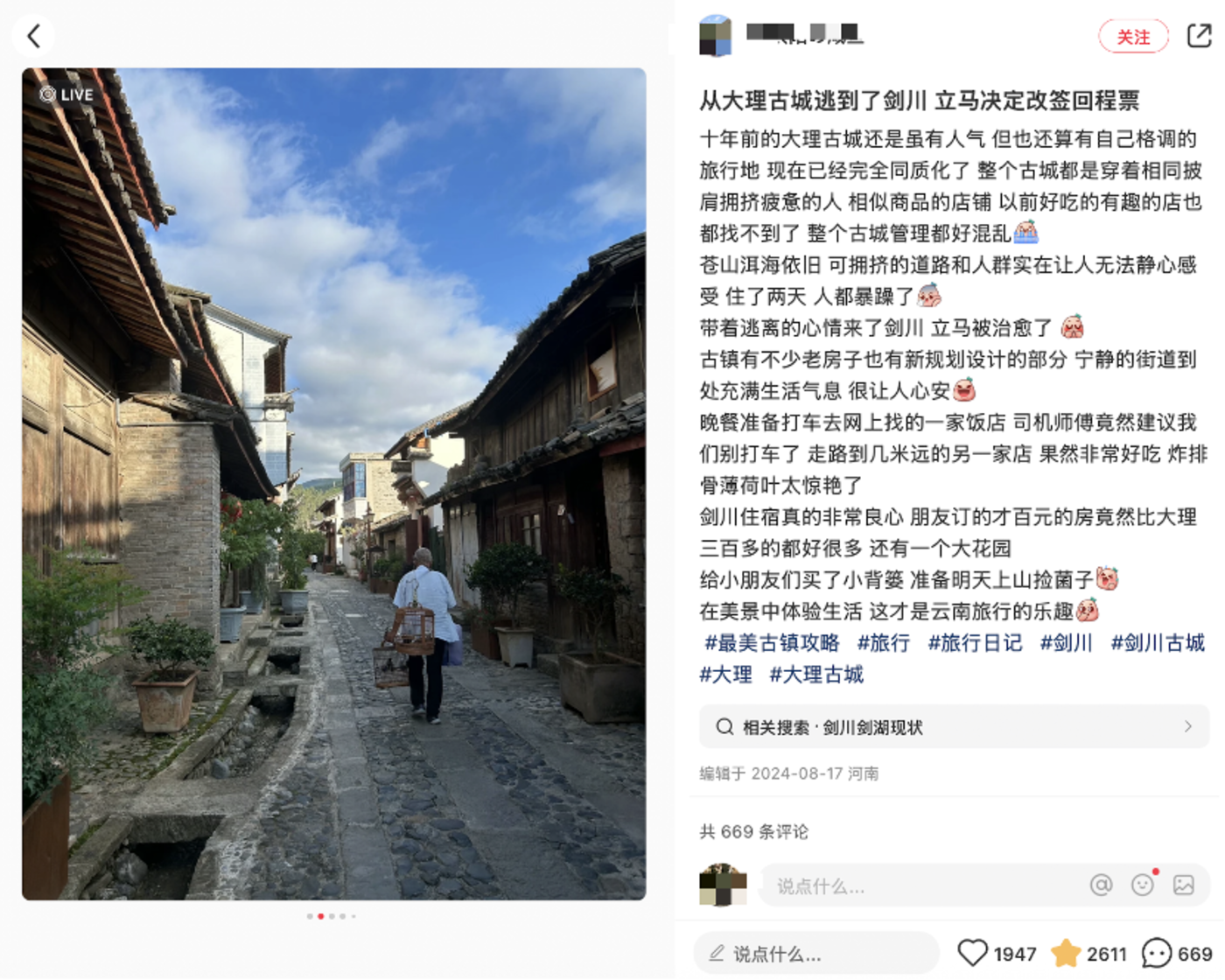 于是,游客开始了新一轮的探寻。「反向旅游」 渐成趋势,越来越多的人转而寻找那些尚未被广泛认知的古镇。例如,许多前往云南地区古镇的游客,首选目的地已不再是传统热门的丽江古城、大理古城,而是巍山、剑川等更为小众的古镇。有游客在社交媒体上分享从大理古城转往剑川古城的经历,认为大理古城已失去往日格调,充斥着同质化商铺、拥挤的人流与相似的 「游客披肩」,而剑川则仍保留着生活气息与宁静氛围,体验更佳。