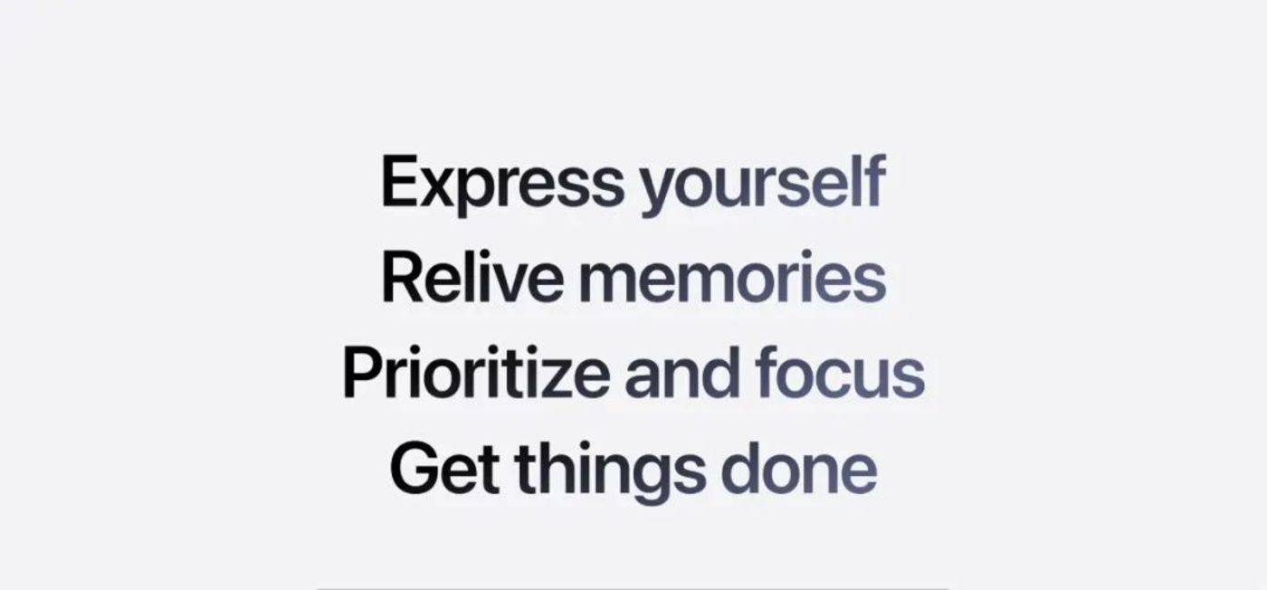 「苹果智能」 的应用包括了表达自己、重温回忆、 确定优先级与把事情做好  图源:发布会截图